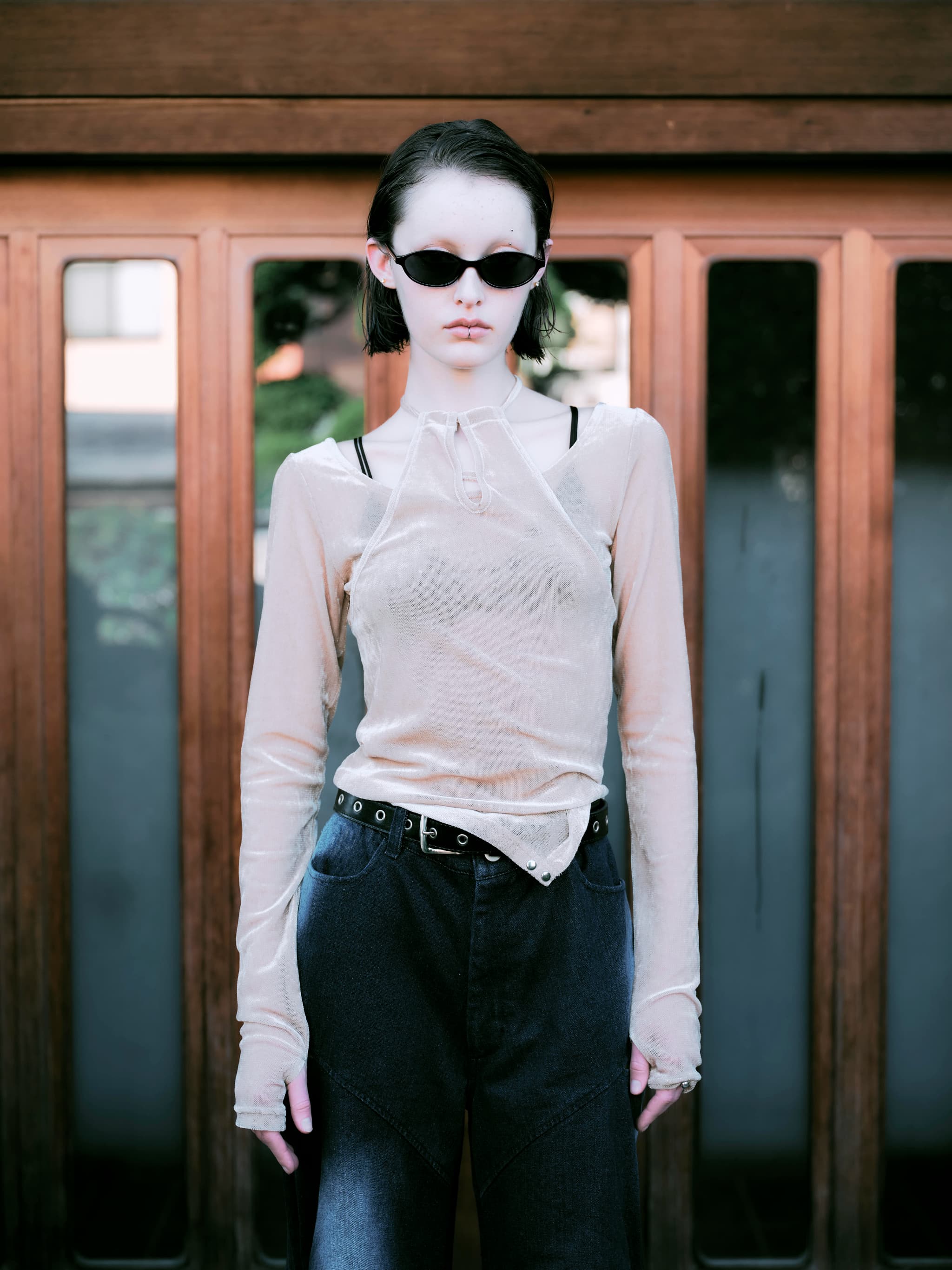 SHEER VELOUR HALTERNECK TOPS - BEIGE