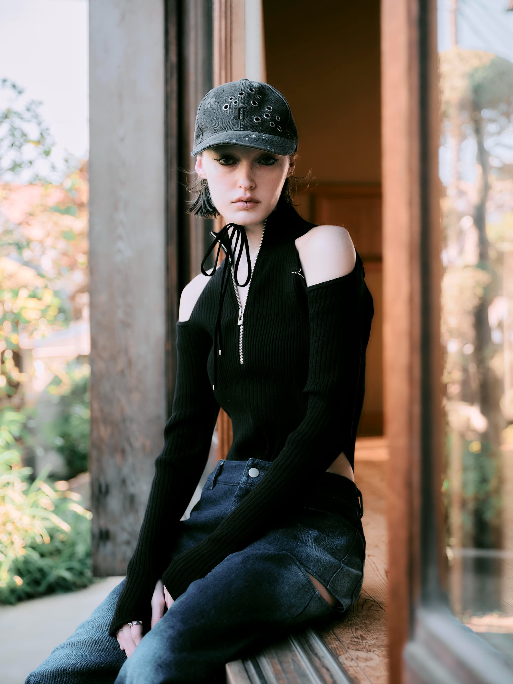 EYELET DESIGN ZIP UP HOODIE-CHARCOAL GRAY