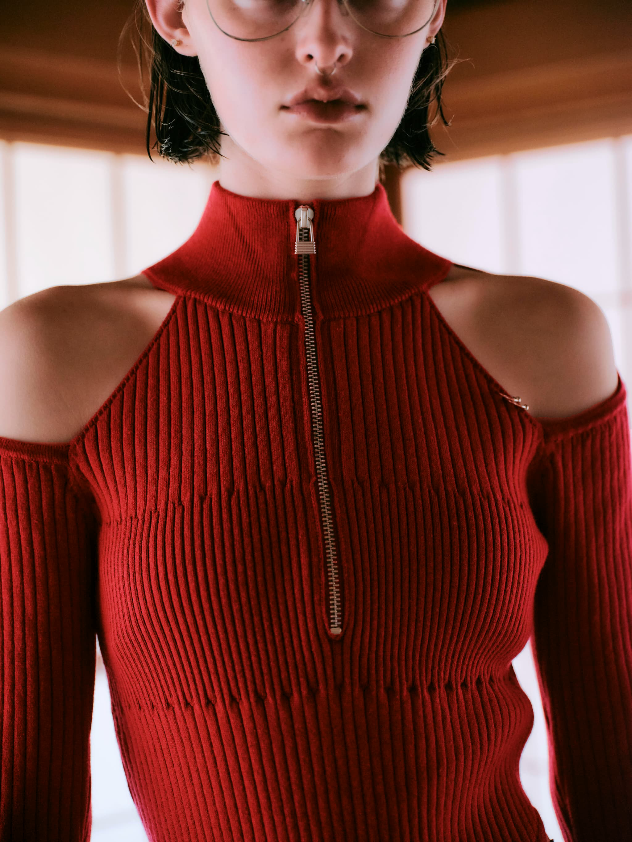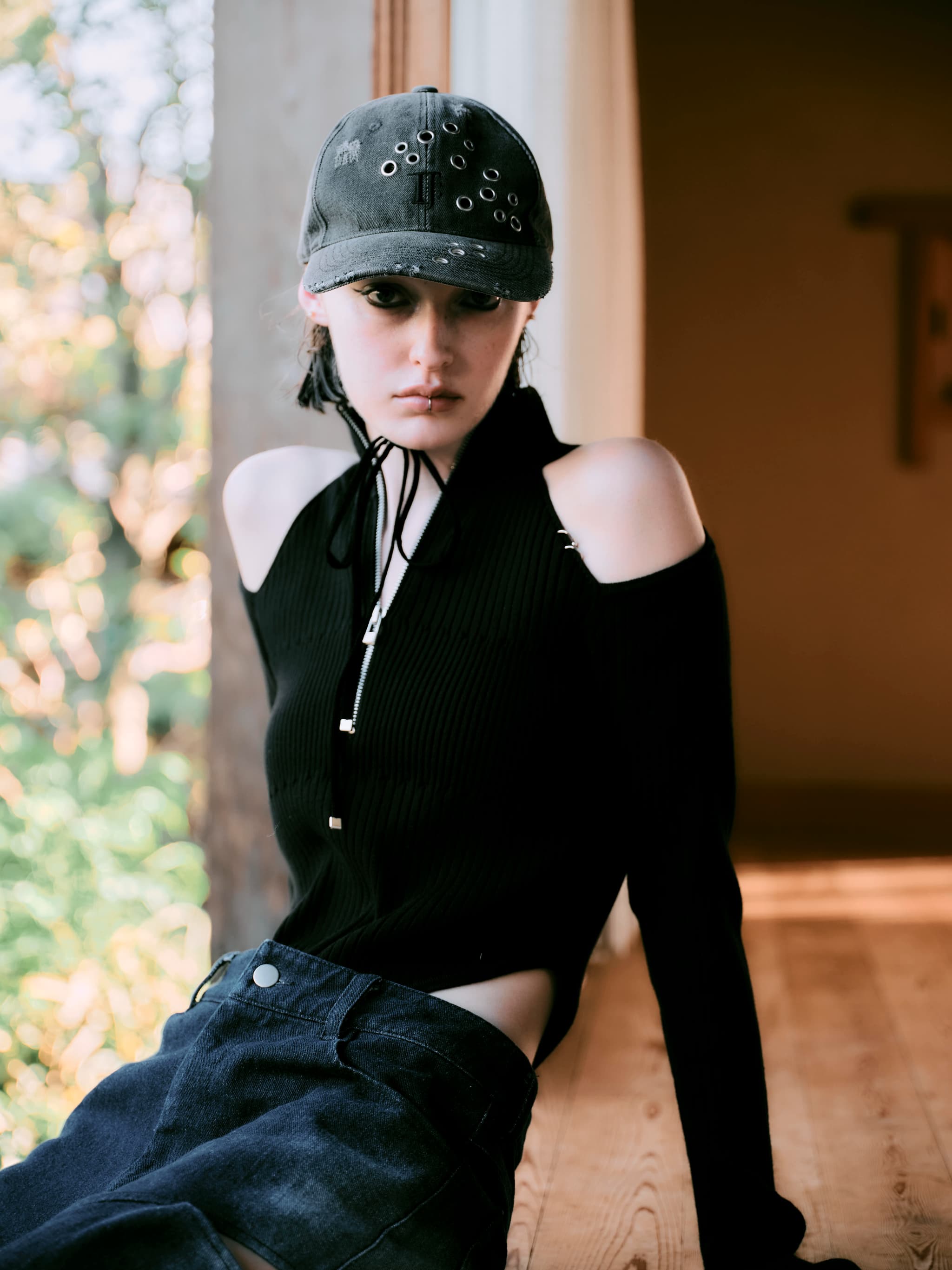 肩を大きく開けたオフショルダー風デザインに、ピアスディテールやフロントジップのメタル感を加え、シャープで洗練された印象に仕上げました。