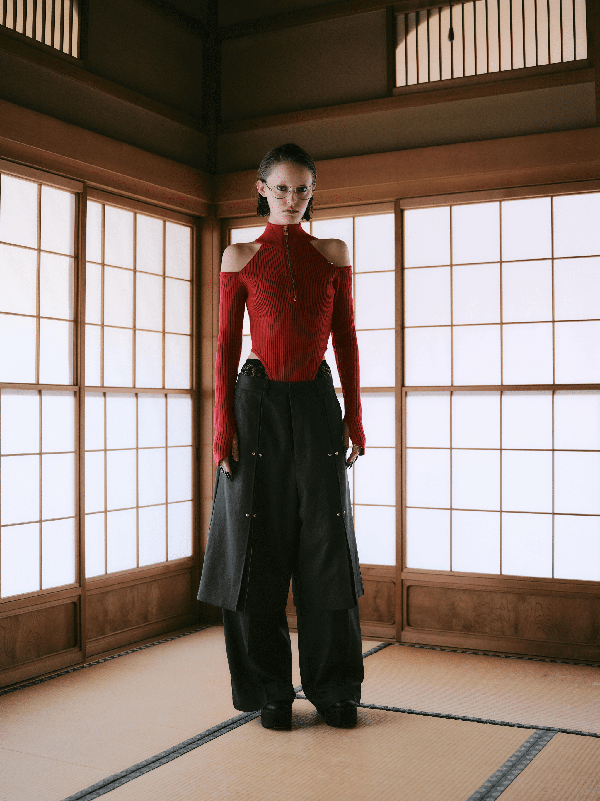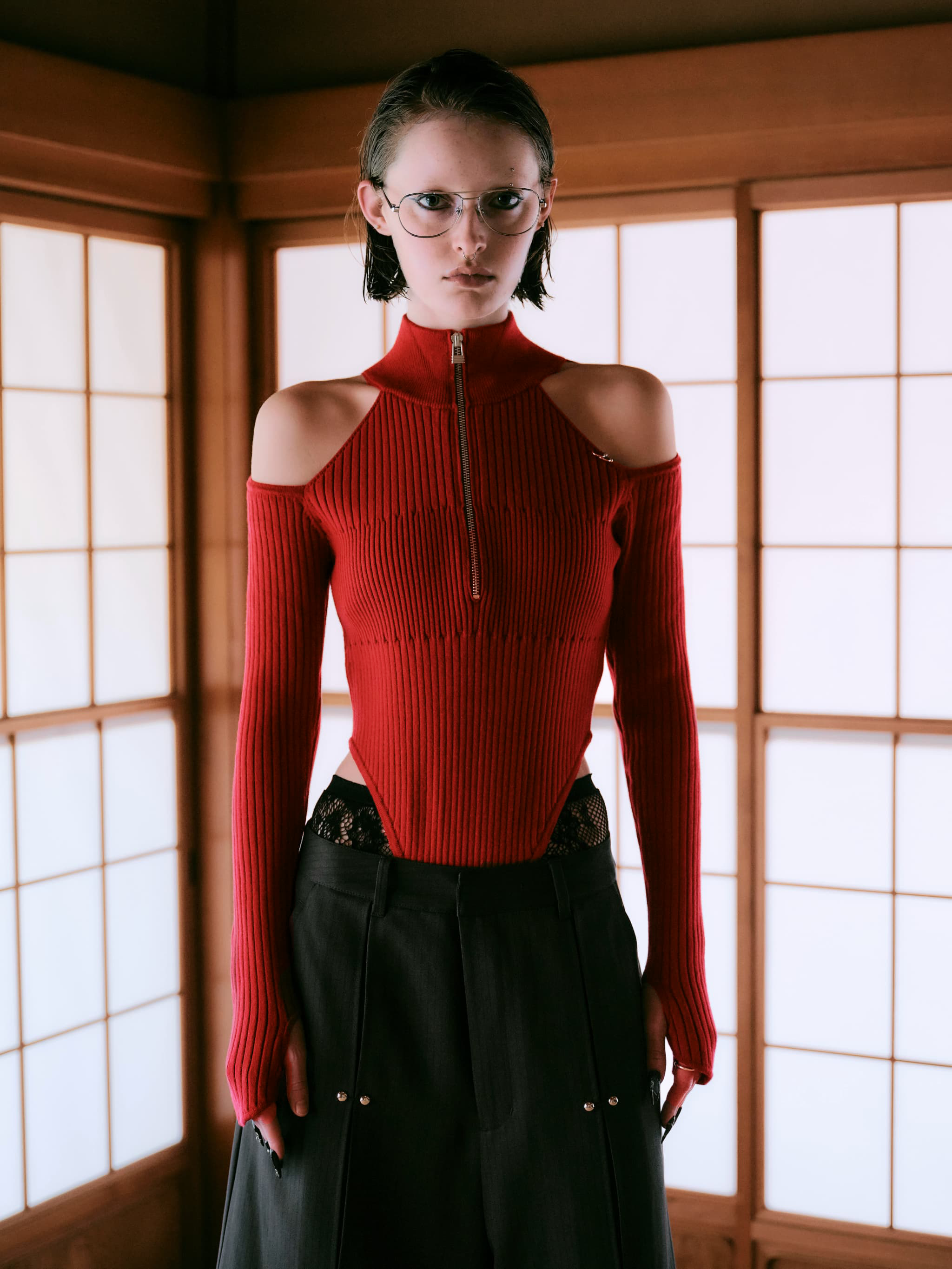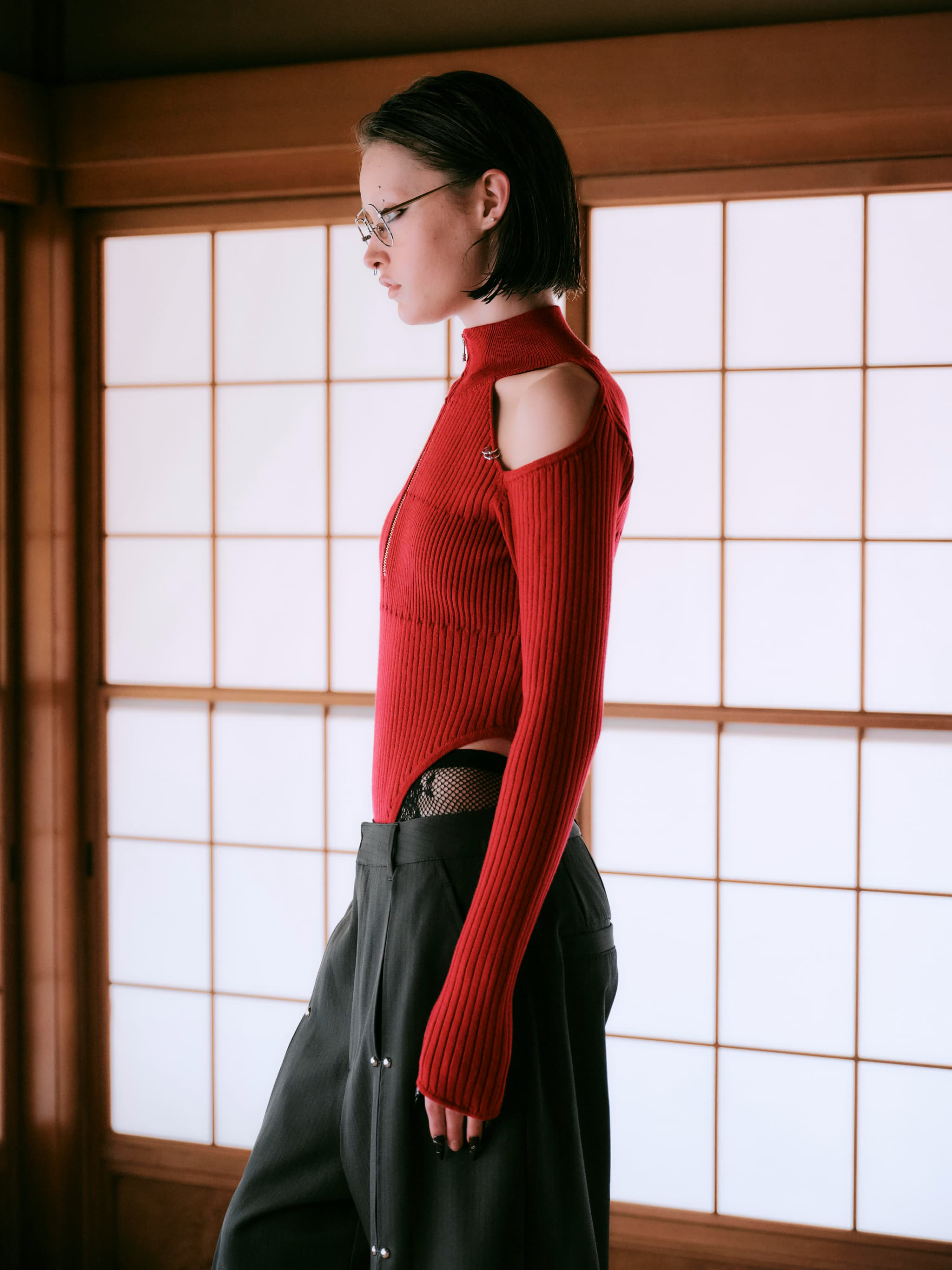 肩を大きく開けたオフショルダー風デザインに、ピアスディテールやフロントジップのメタル感を加え、シャープで洗練された印象に仕上げました。