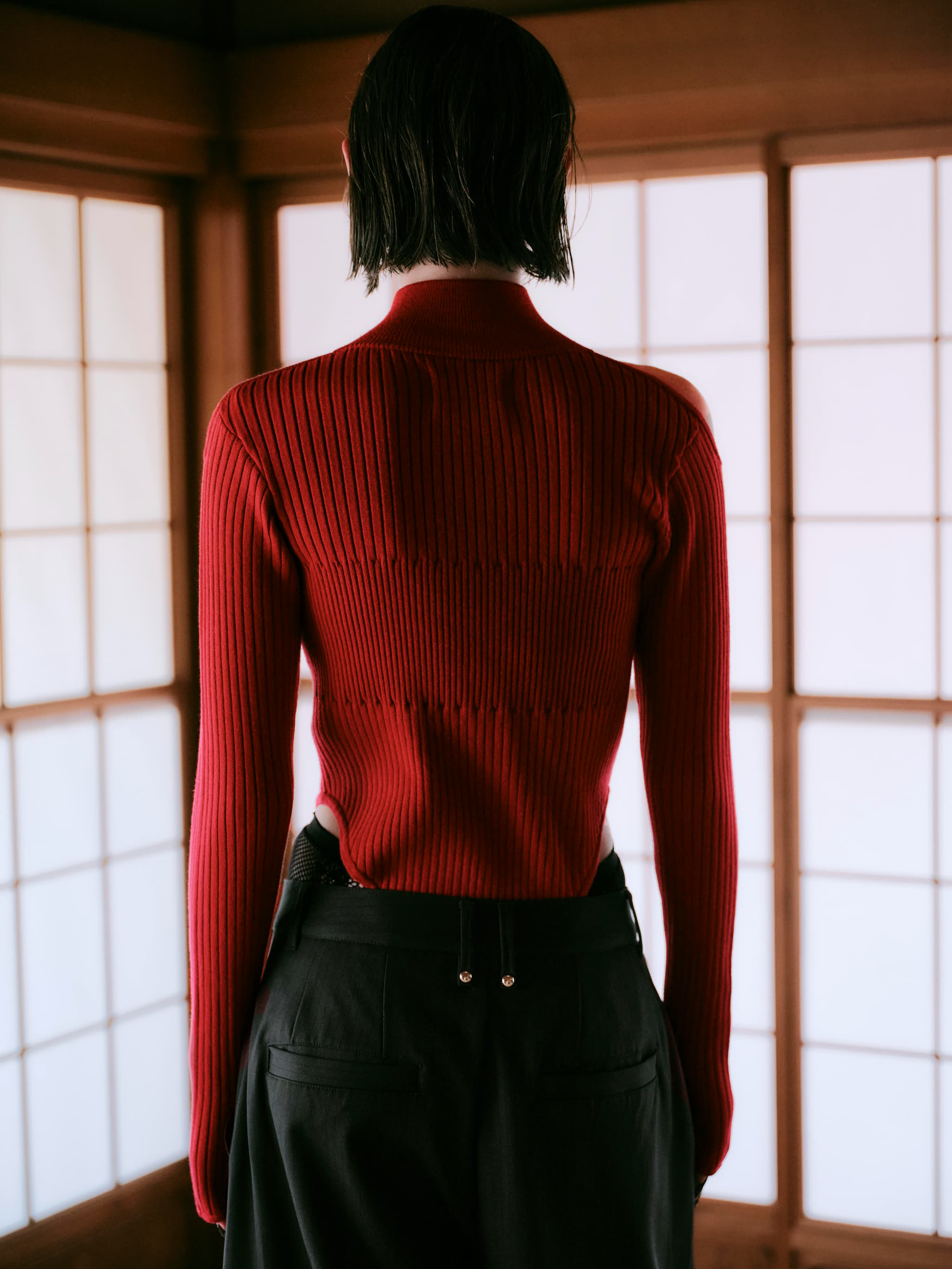 身体のラインを美しく引き立てるリブ編みは、部分的にリブ幅を切り替えることで立体感と陰影を生み、シンプルながら奥行きのある表情を演出します。