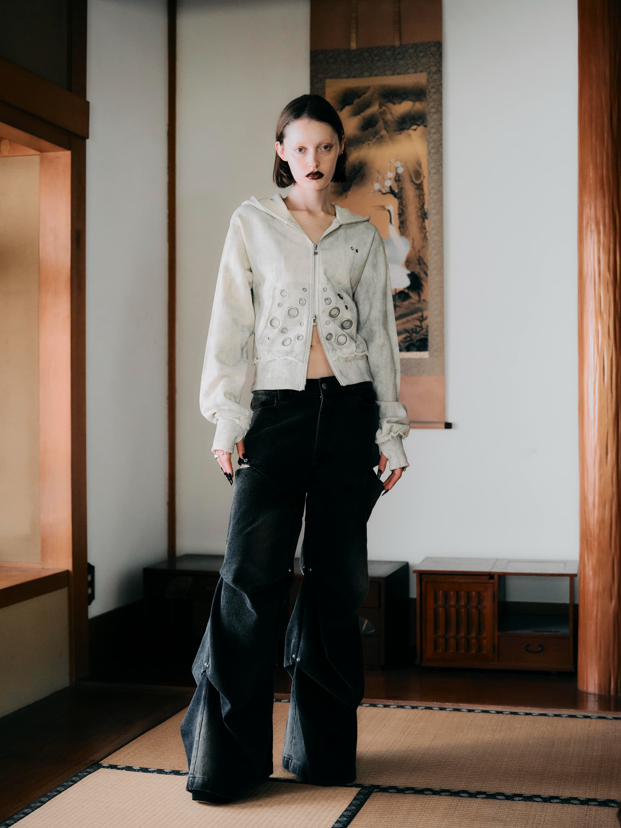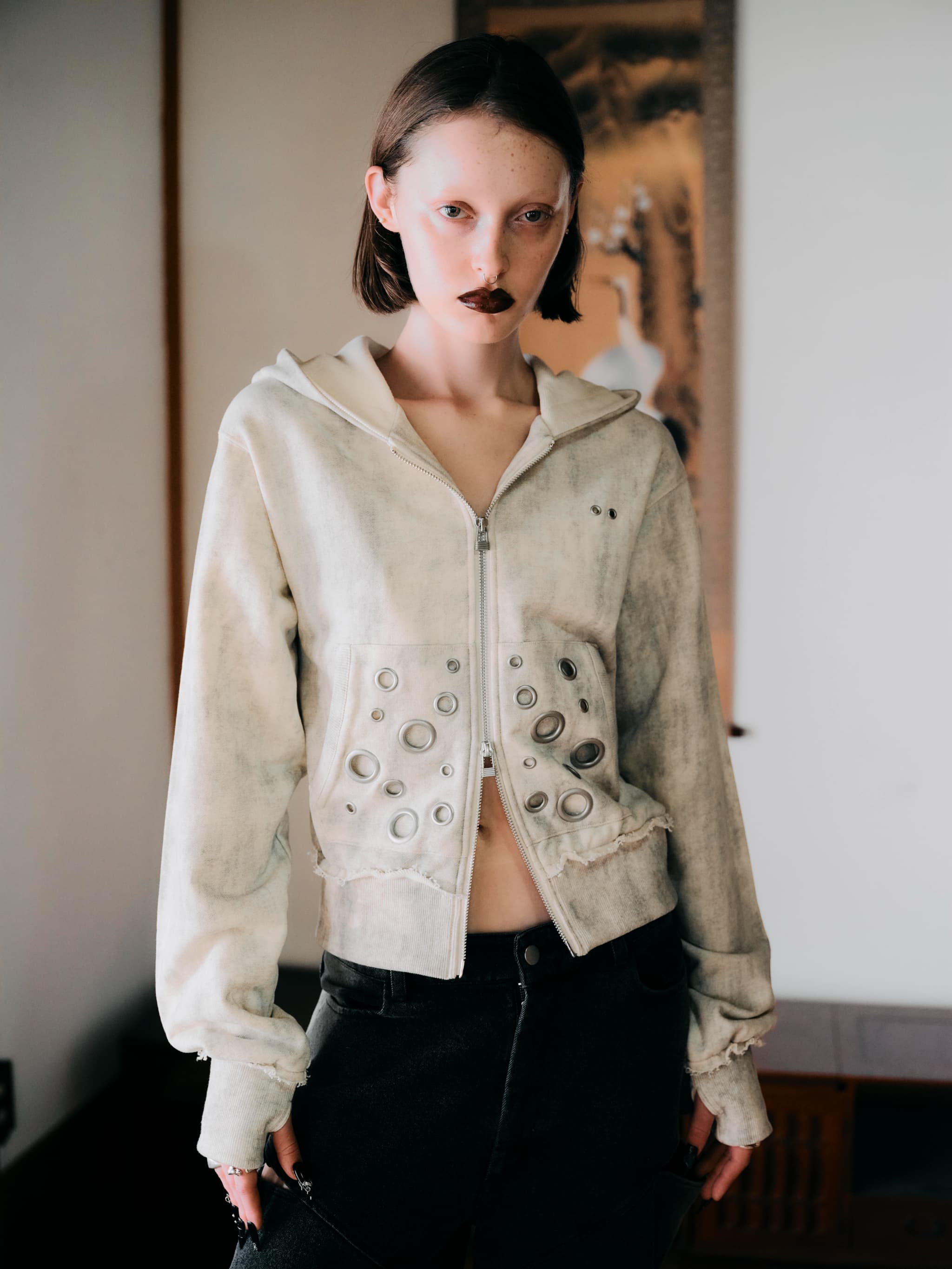 大胆なメタルアイレットを散りばめたジップアップパーカー。