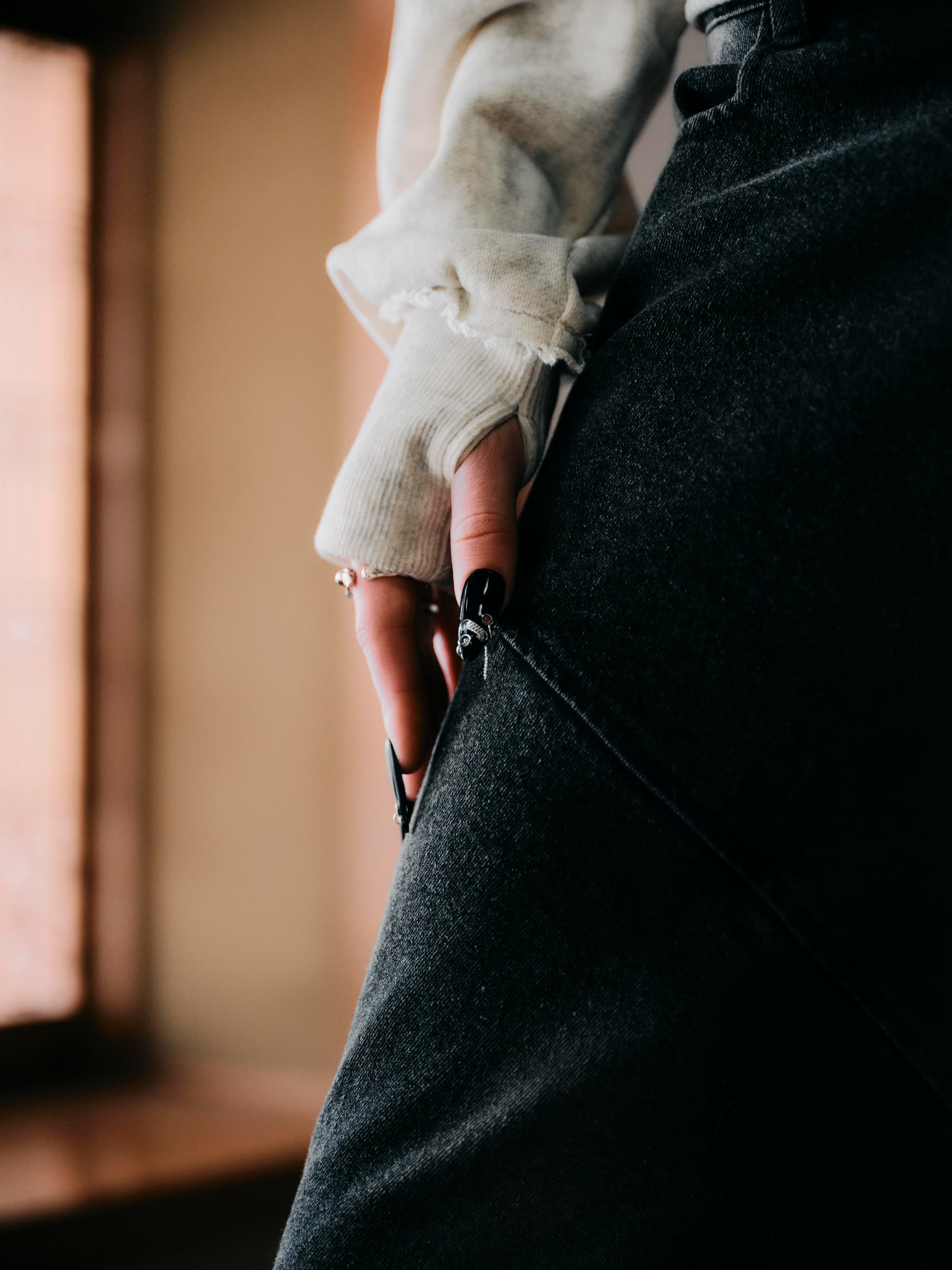 ダメージ感のあるポケット口のほつれや、自然な色むらが、カジュアルながらも洗練された印象を与えます。