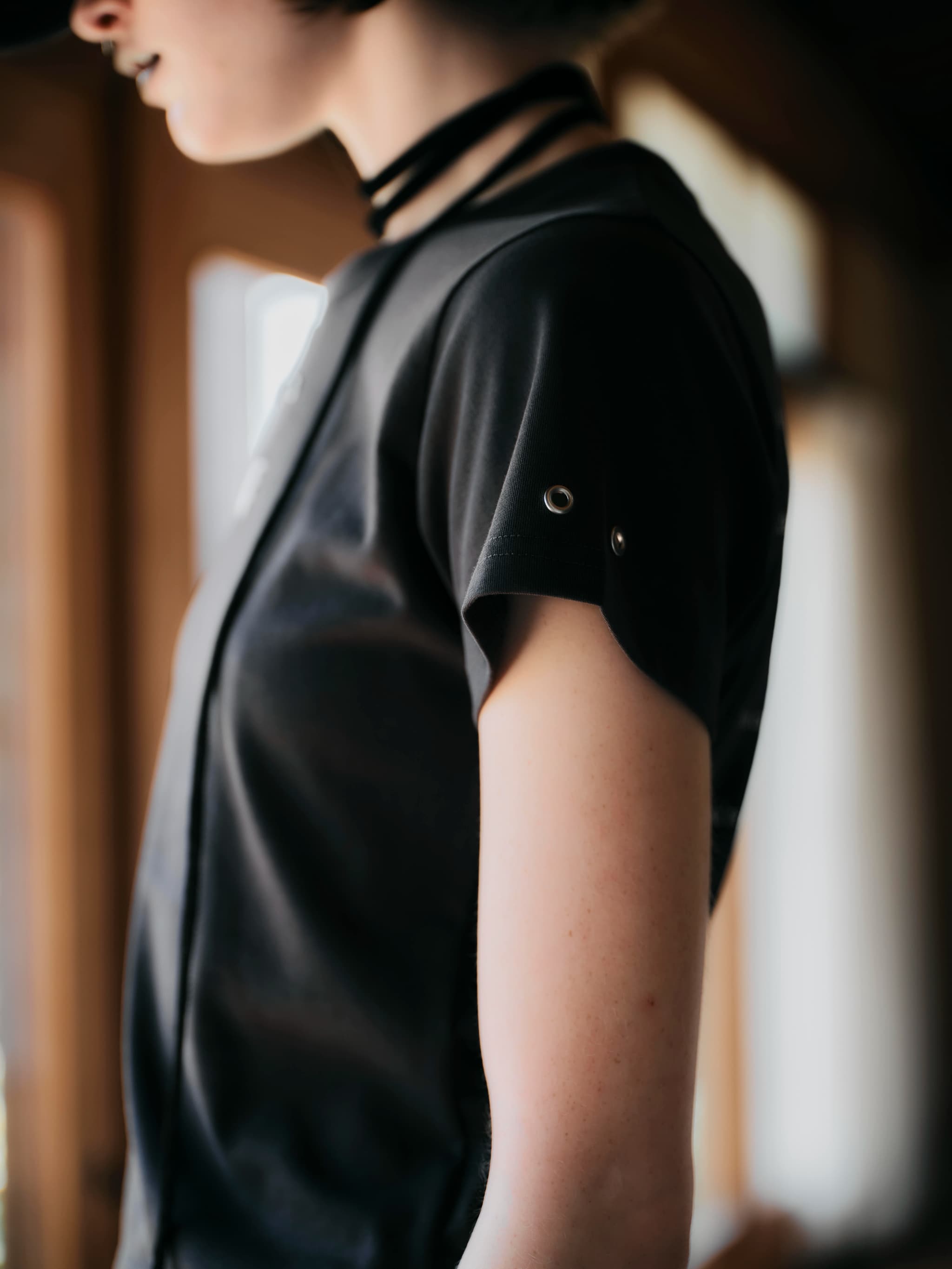 さらに、フロントと左袖に並ぶ2つのアイレットは、ブランドロゴの「 : 」をモチーフにした遊び心あるデザイン。