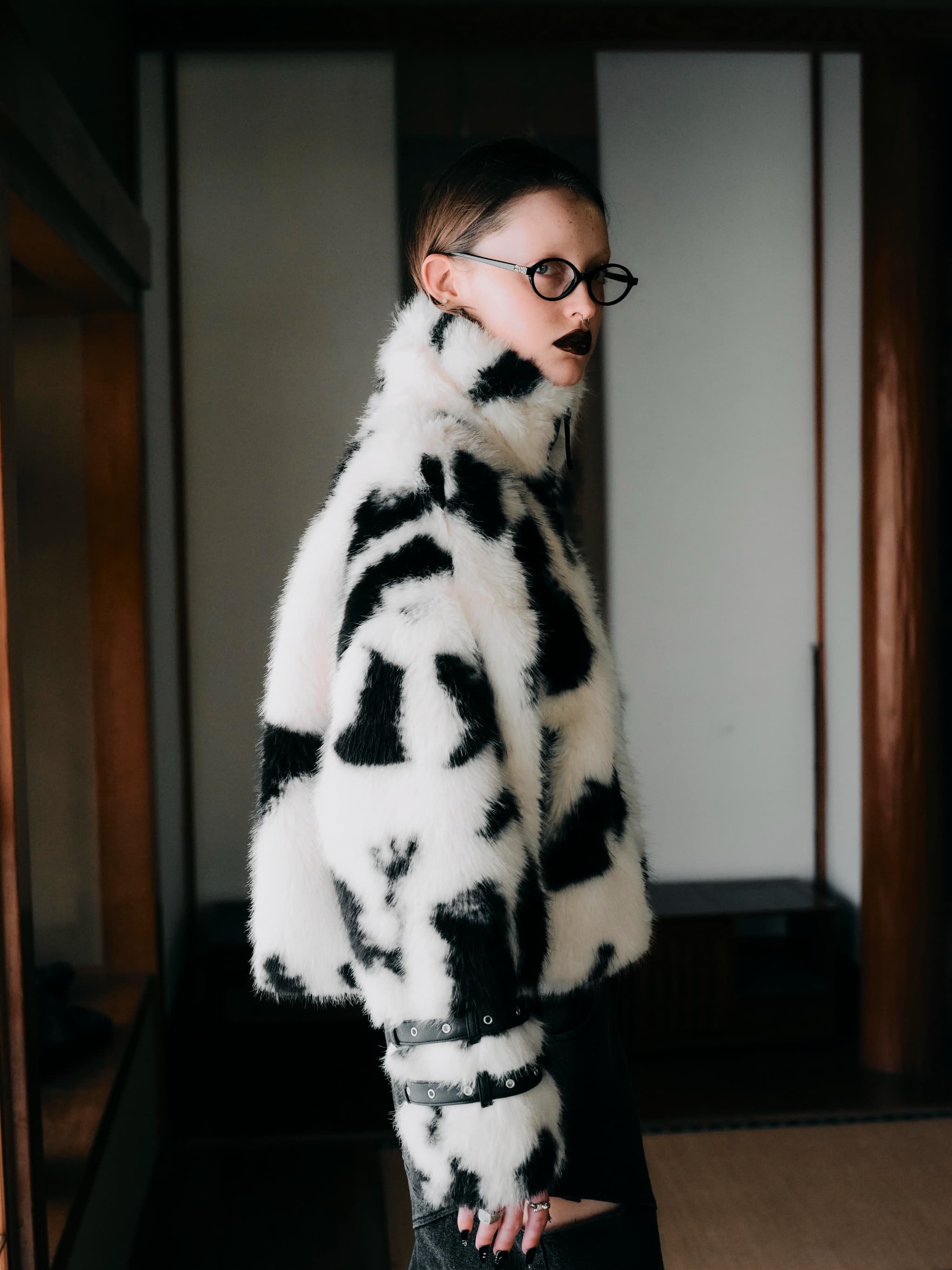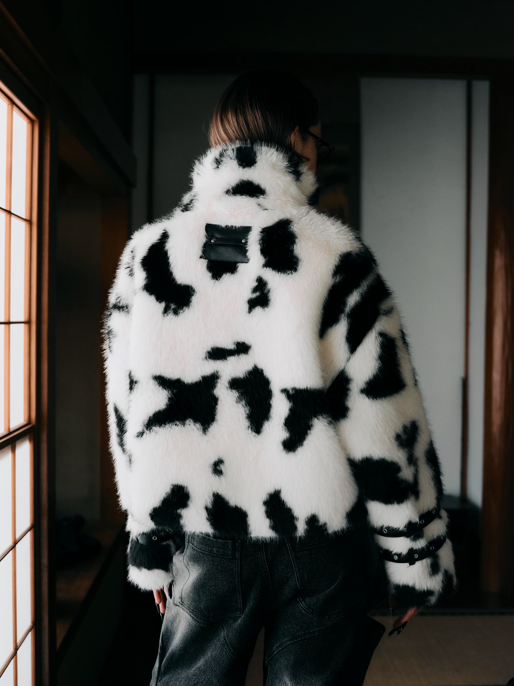 ボリュームのある牛柄フェイクファーにレザーのエッジを効かせた、今年らしい存在感抜群のファージャケット。