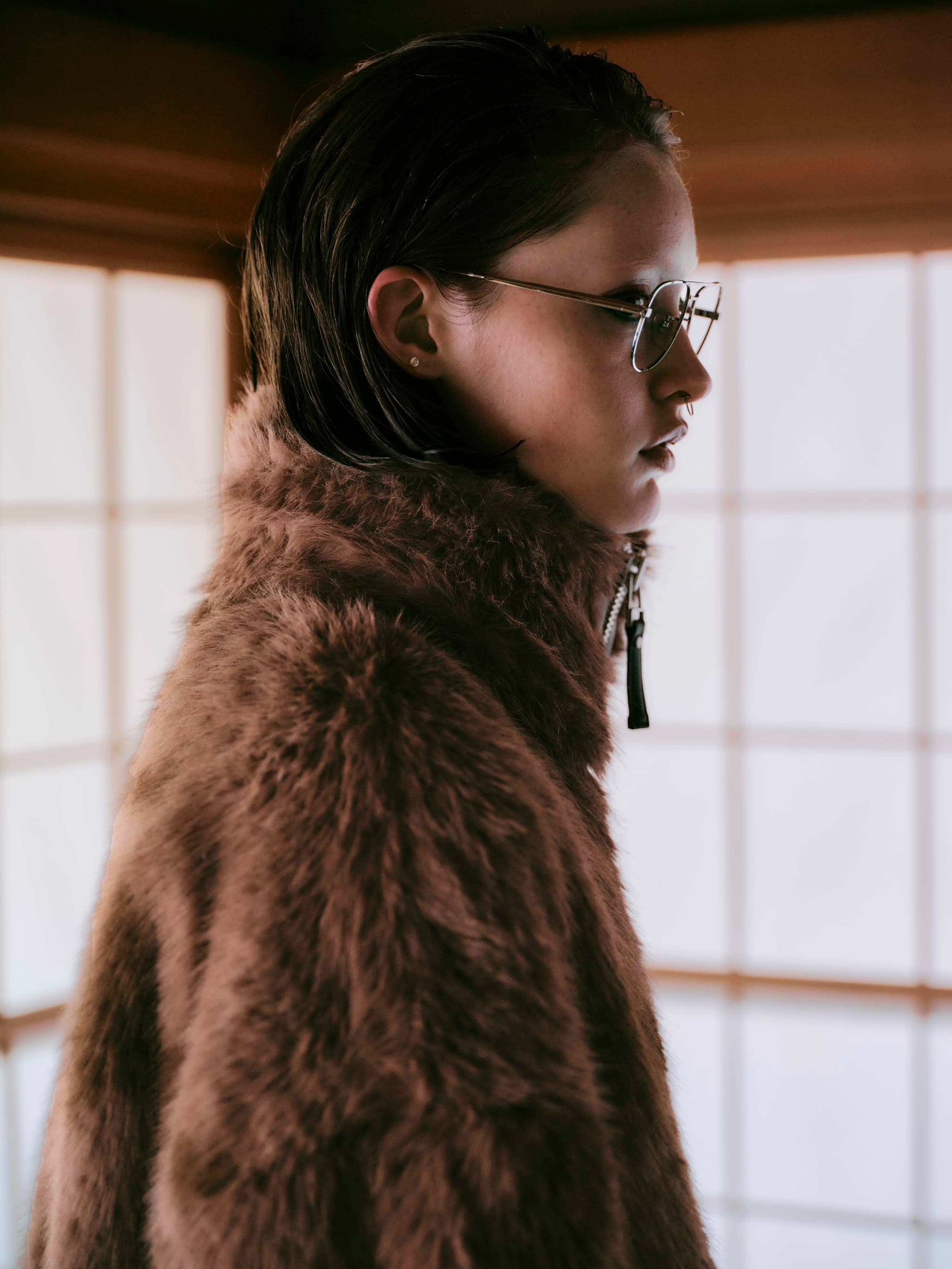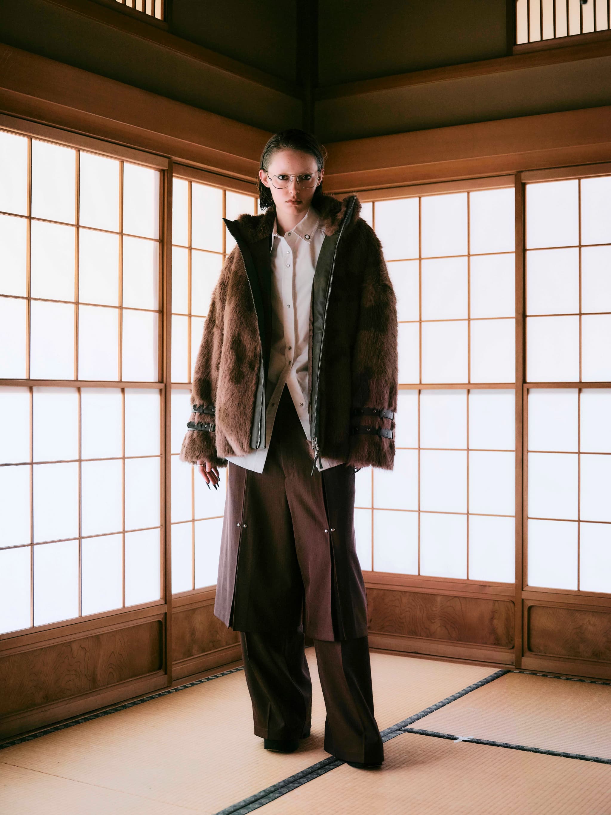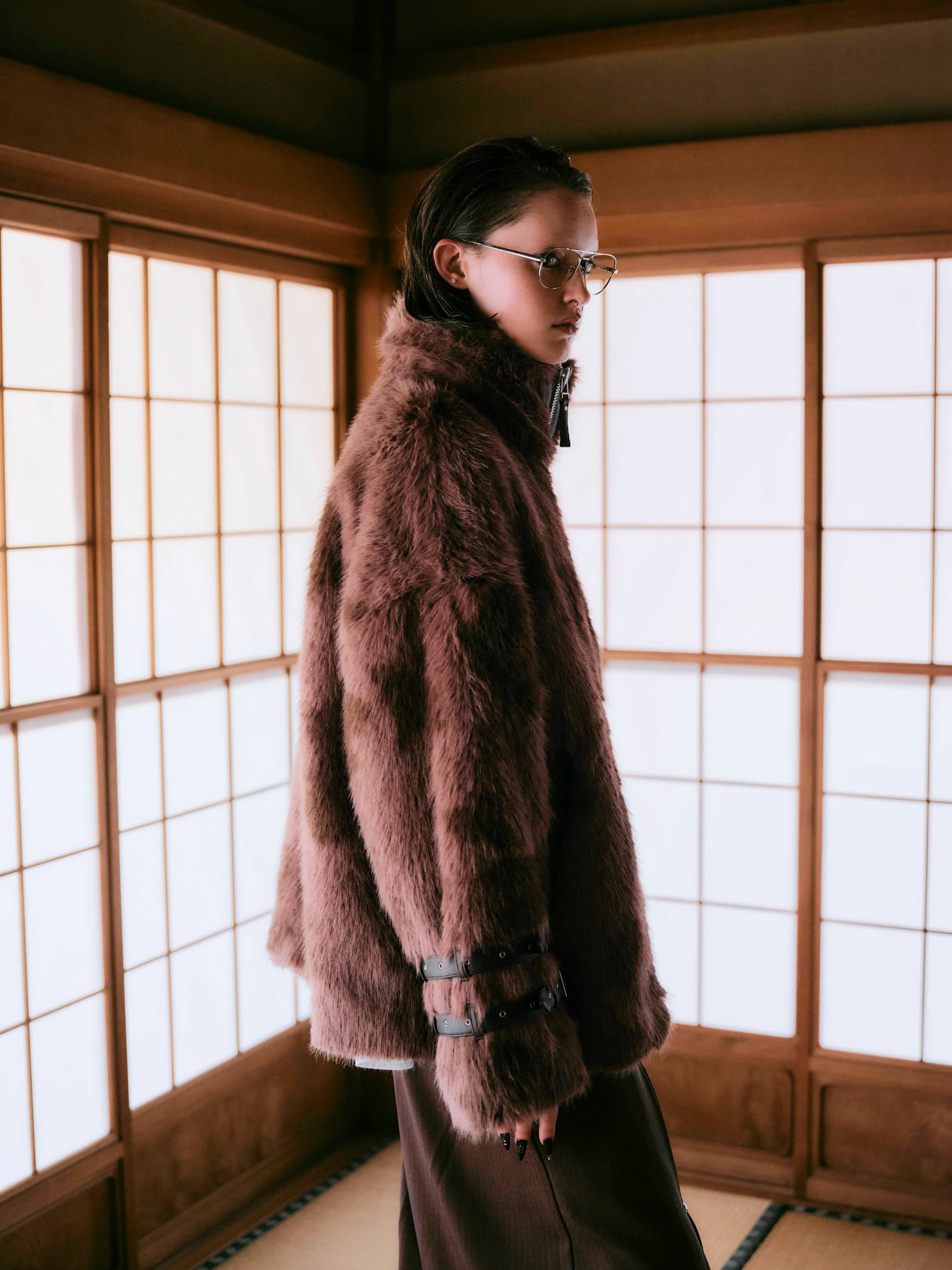 ふんわりとした毛足の柔らかさと、袖ベルト・フロントのダブルジップが生み出すハードなムードが交差し、