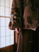 袖にはレザーベルトを2本配し、ボリュームファーとのコントラストを際立たせたデザインに。