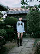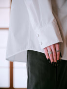 シャツは、ややオーバーサイズのシルエットで、立体的な切り替えが美しいラインを演出。