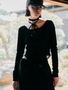 デコルテを美しく見せるネックラインのベロアプルオーバーと、ホルターネックの2点セット。