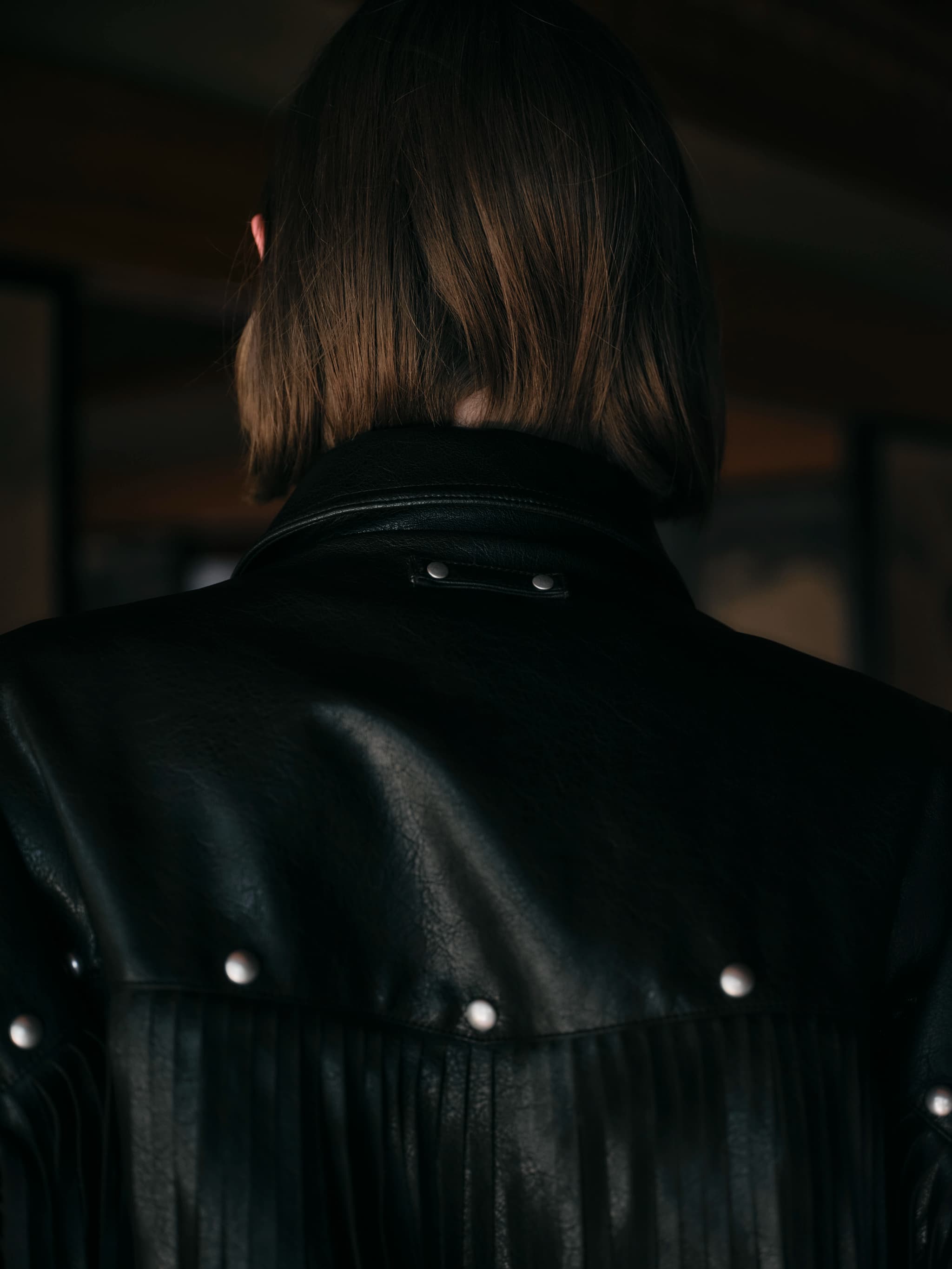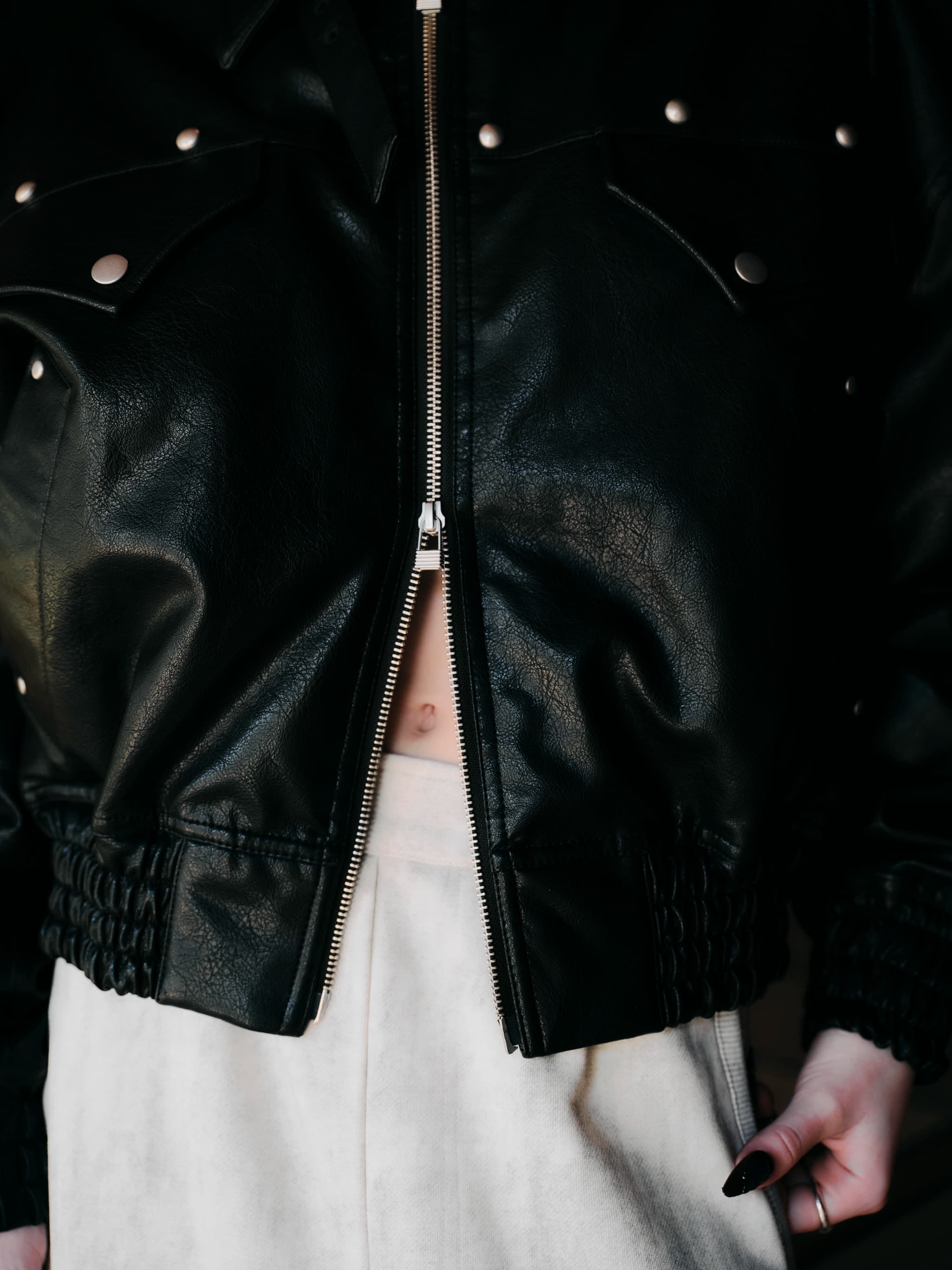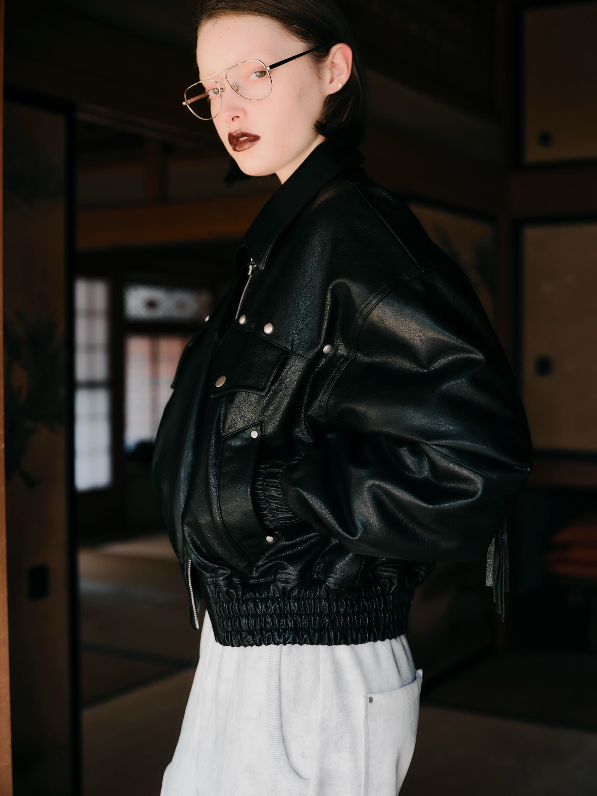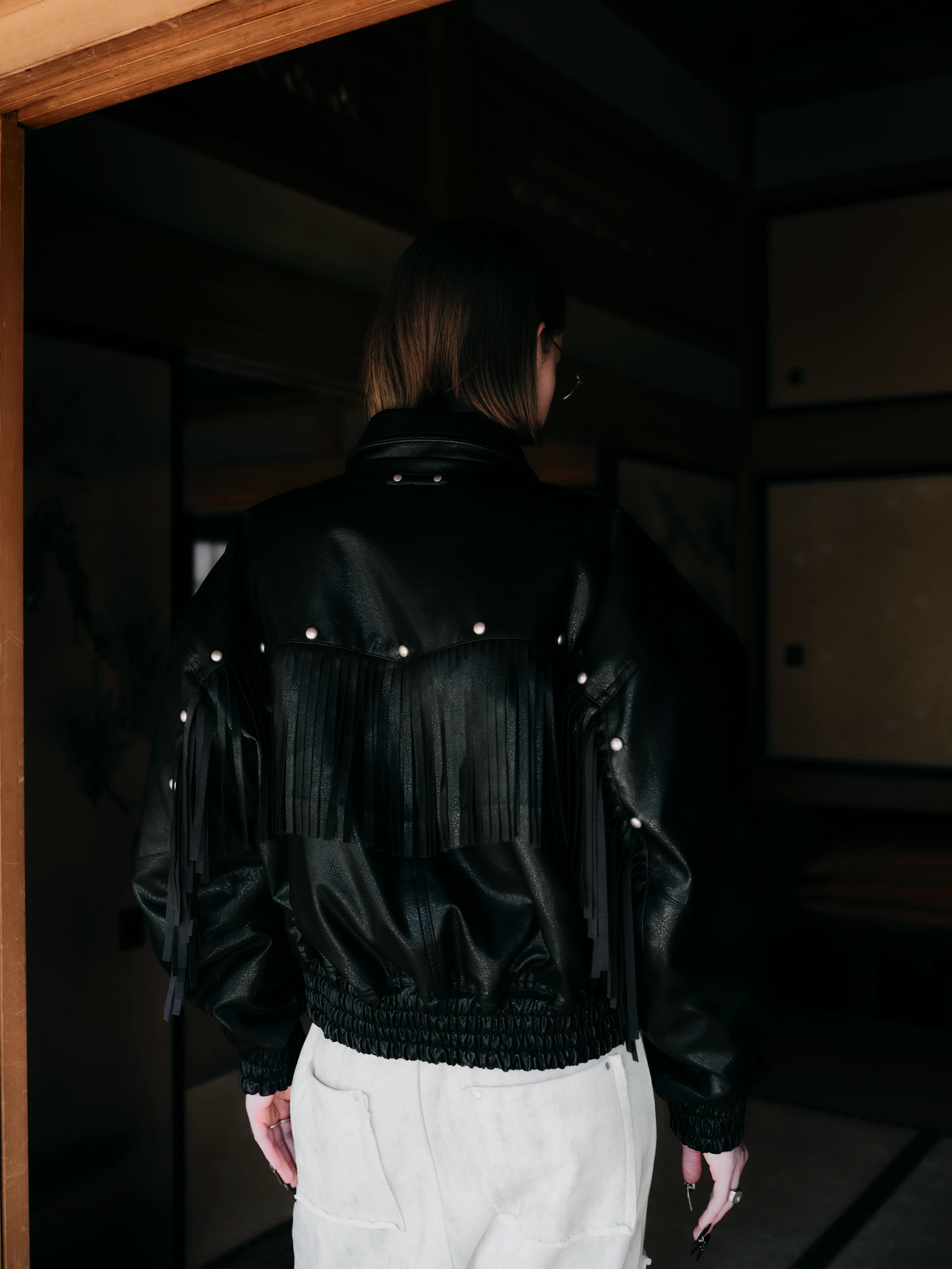 FAKE LEATHER FRINGE BOMBER JACKET-BLACK