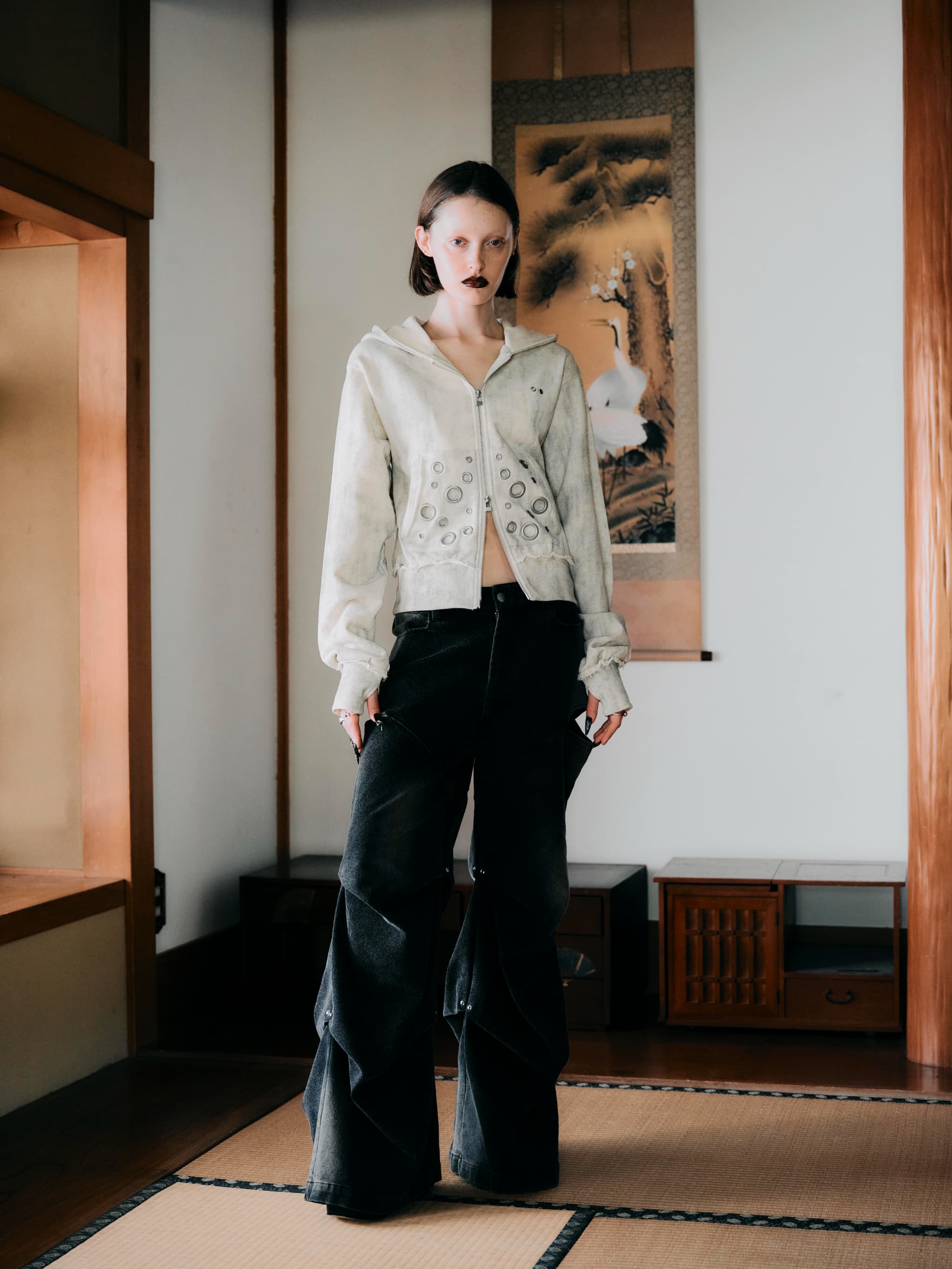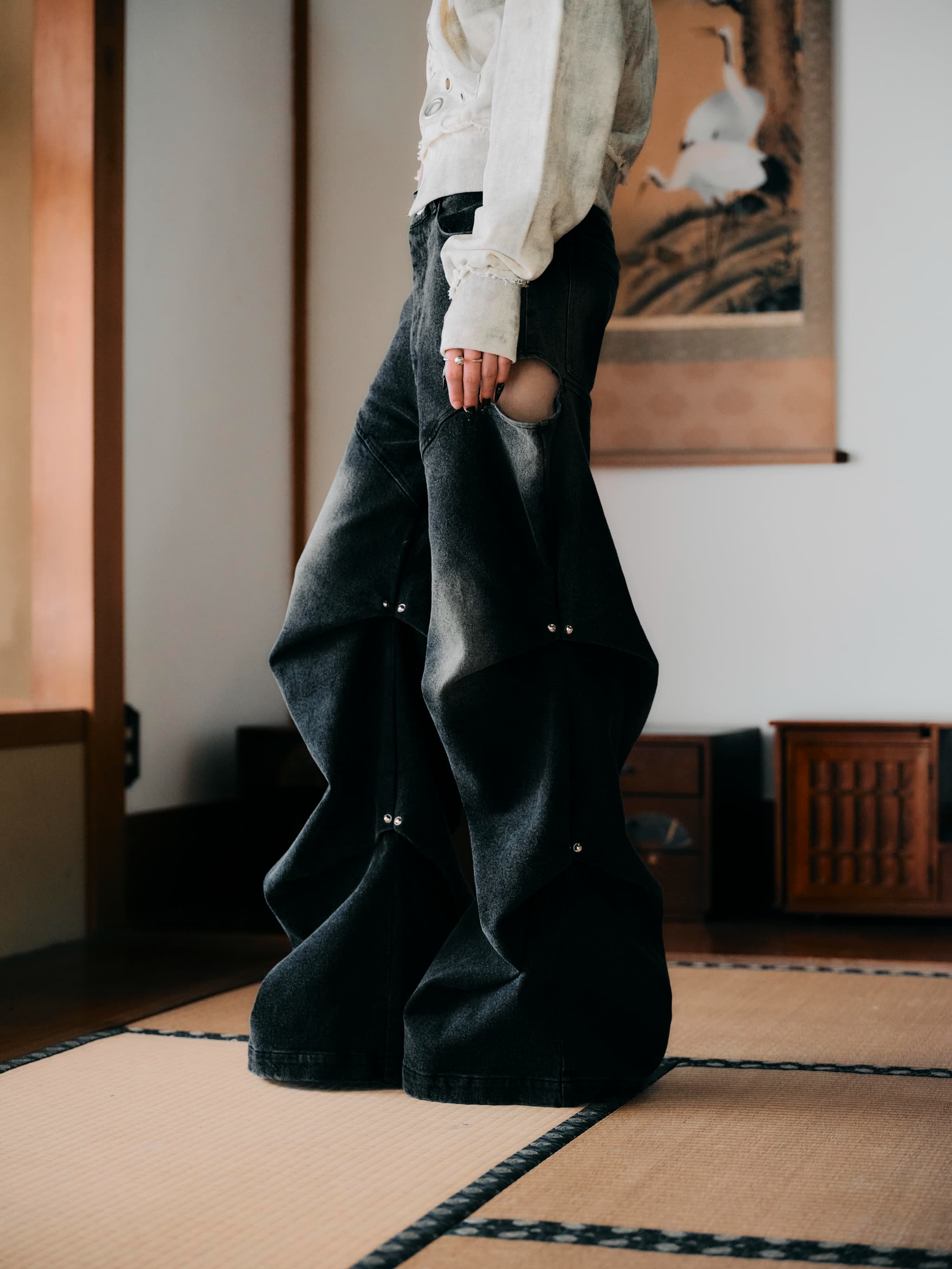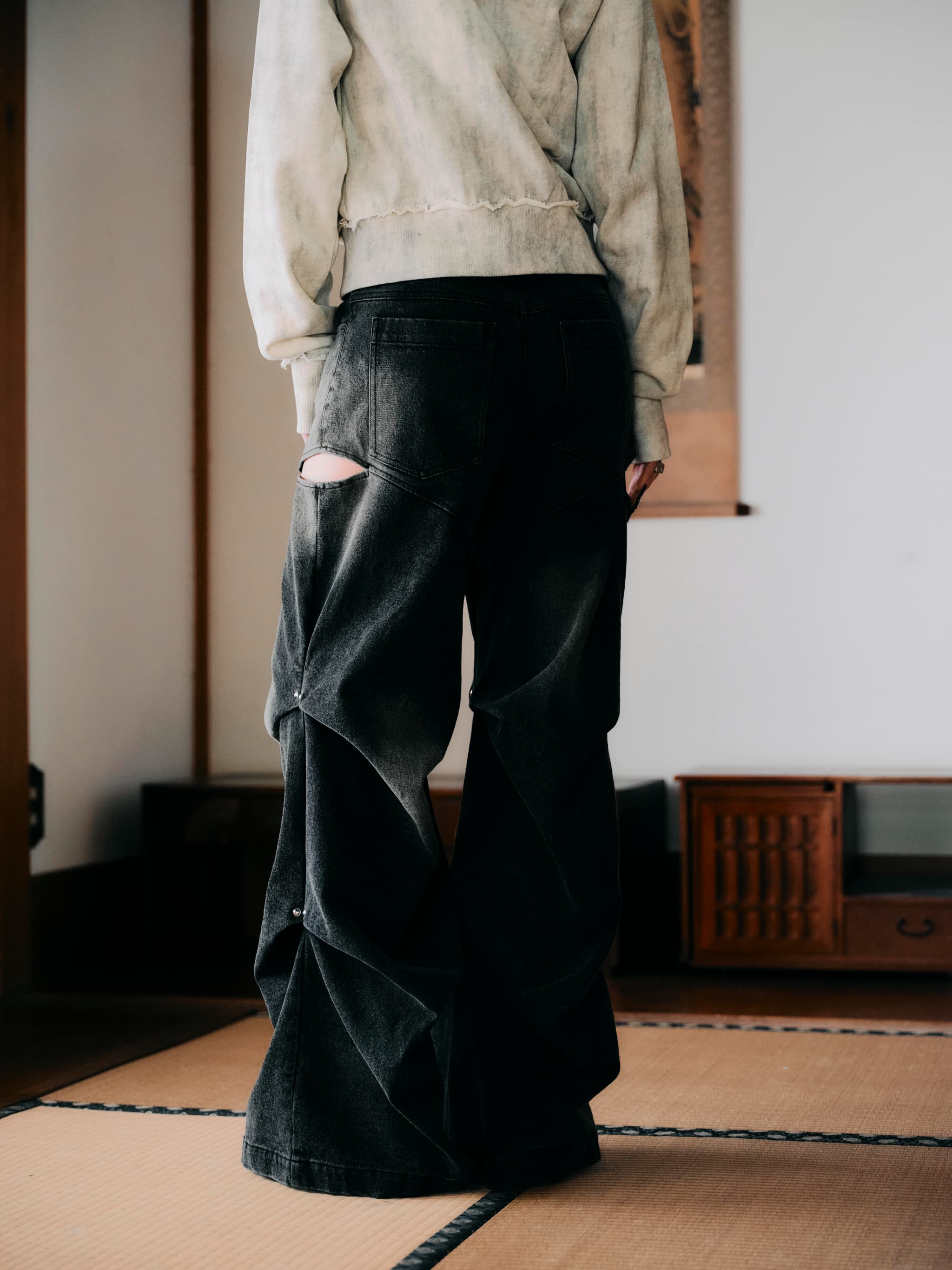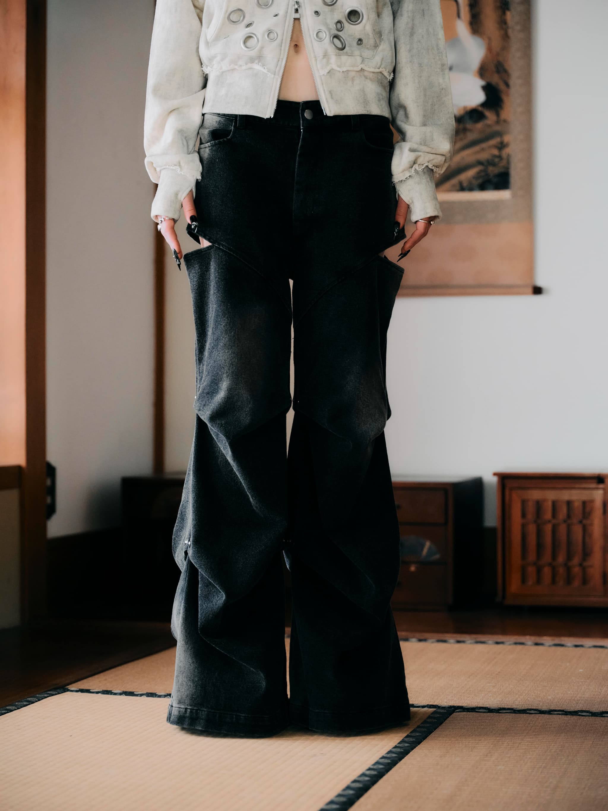 TUCK DESIGN DENIM PANTS-CHARCOAL GRAY