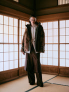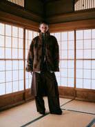 首元まで包み込むスタンドカラーは、防寒性に優れつつモードな佇まいを引き立てます。