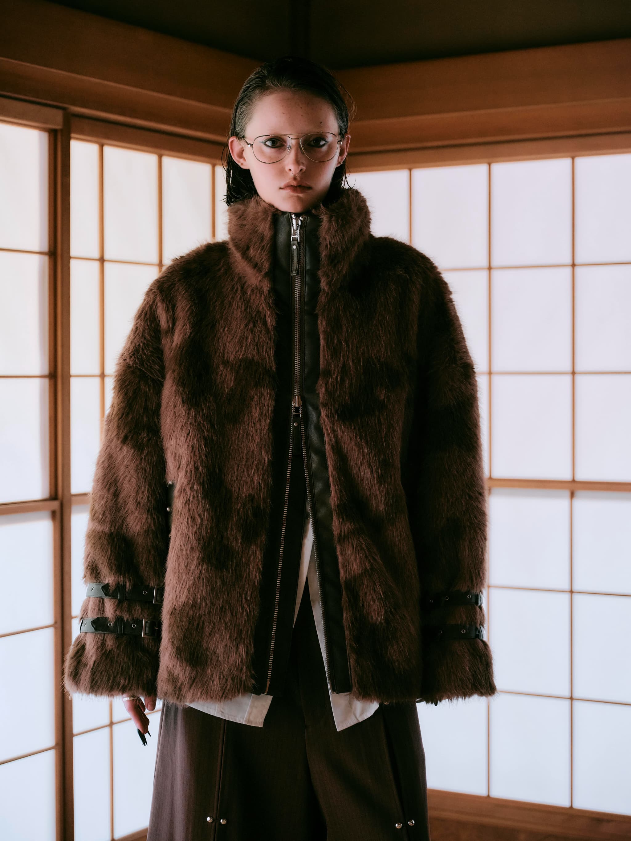 ふんわりとした毛足の柔らかさと、袖ベルト・フロントのダブルジップが生み出すハードなムードが交差し、