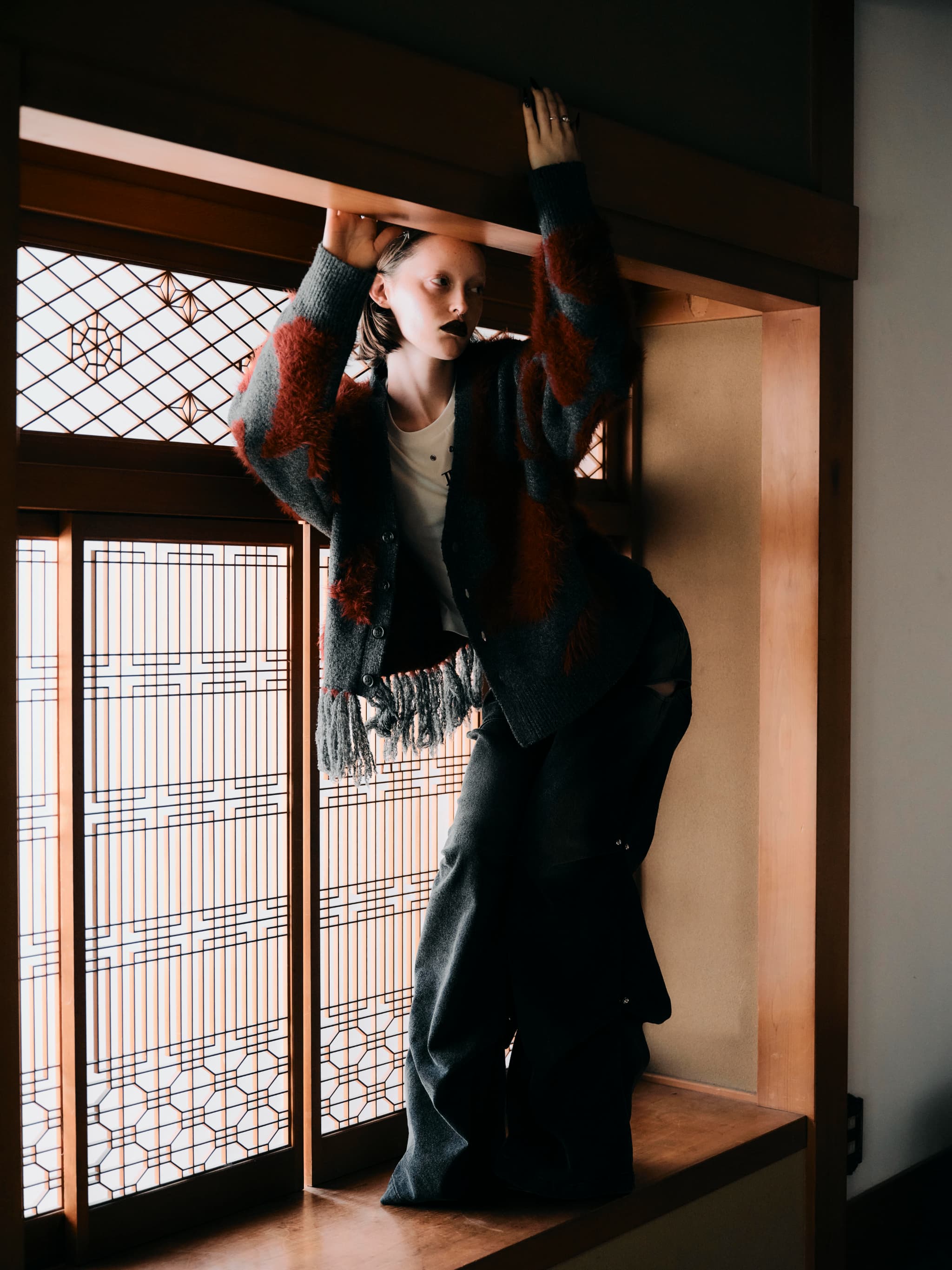 一枚で主役になる存在感を持ちながら、落ち着きと品を兼ね備えた、視線を惹きつけるニットカーディガンです。