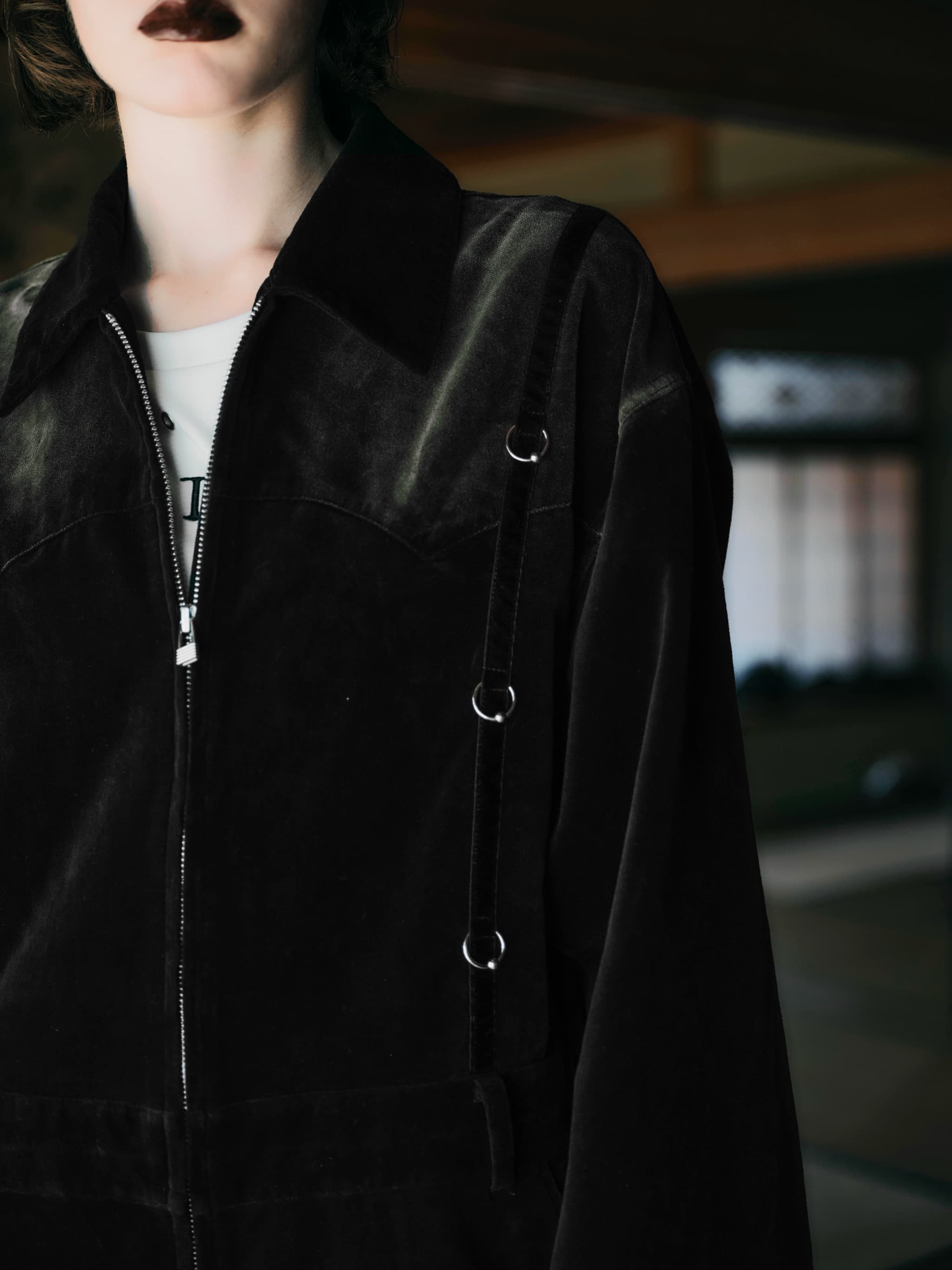 全身を包み込むような存在感を放つ、ベルベット素材のジャンプスーツ。
