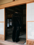 ゆったりとしたワイドシルエットとストレートなラインが、身体の動きを美しく引き立てます。 フロントのジップとピアスディティールがアクセントとなり、シンプルでありながらエッジィな印象を演出。