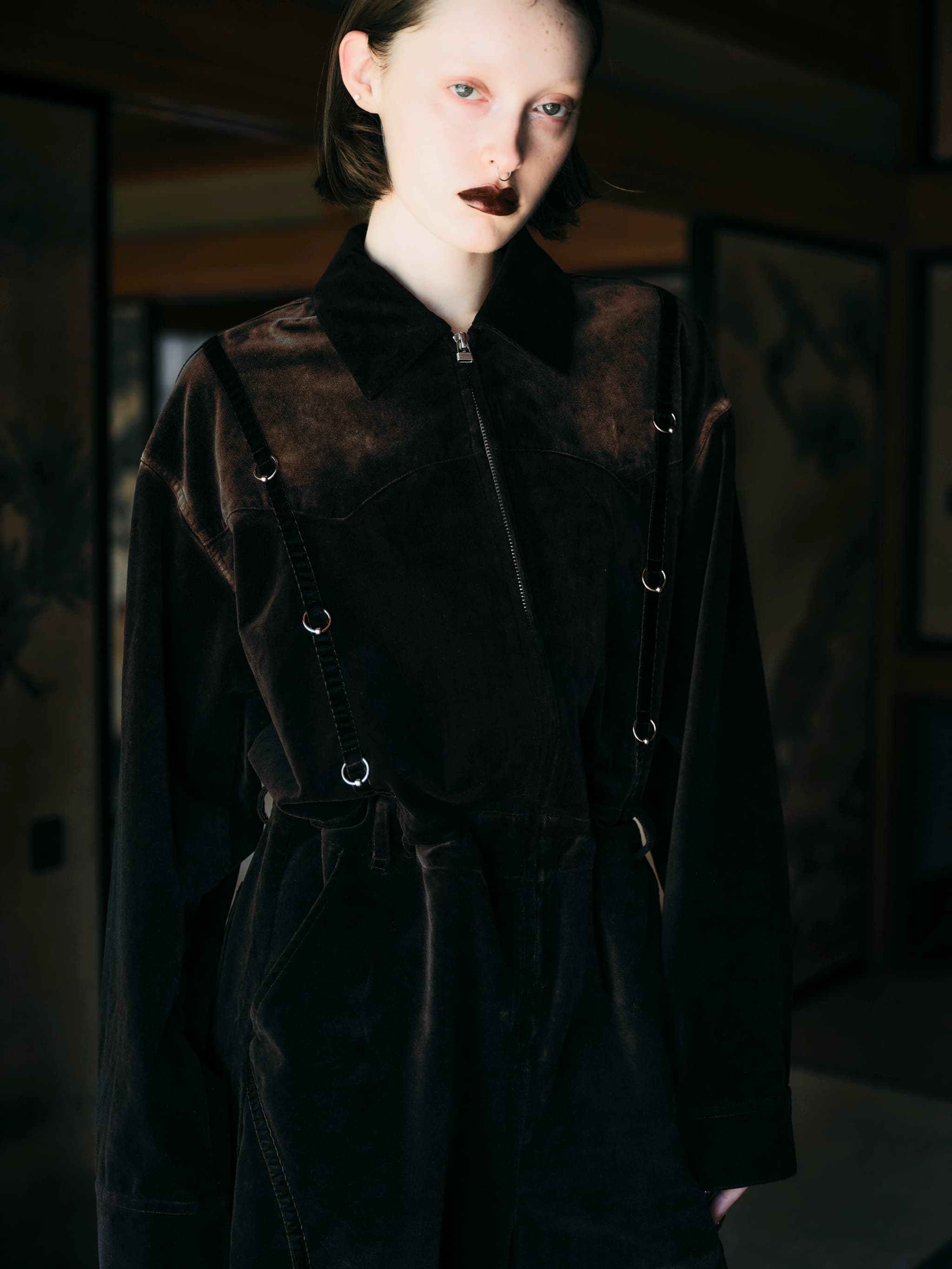 BLEACH OUT VELVET JUMP SUIT-BLACK×BROWN