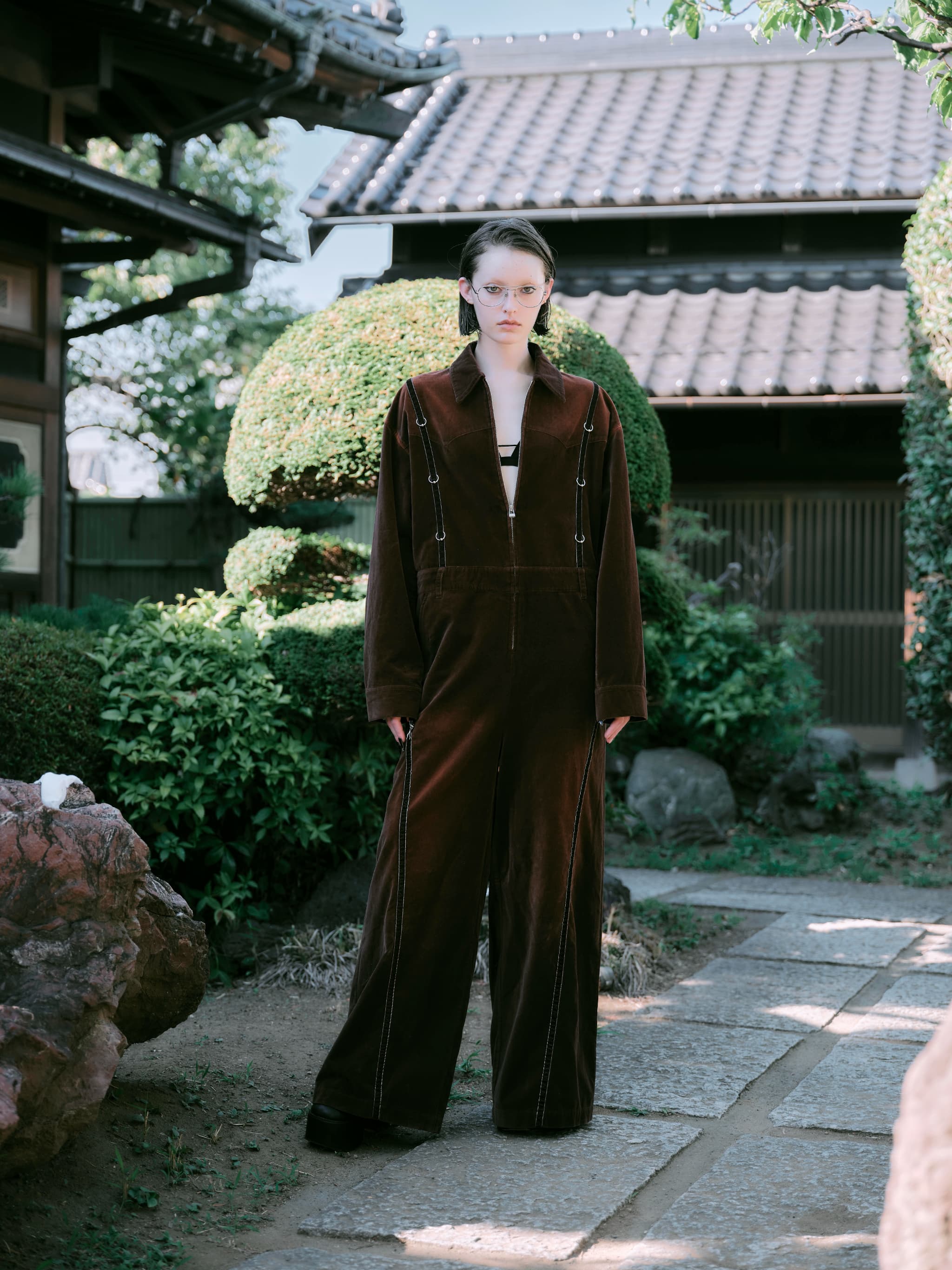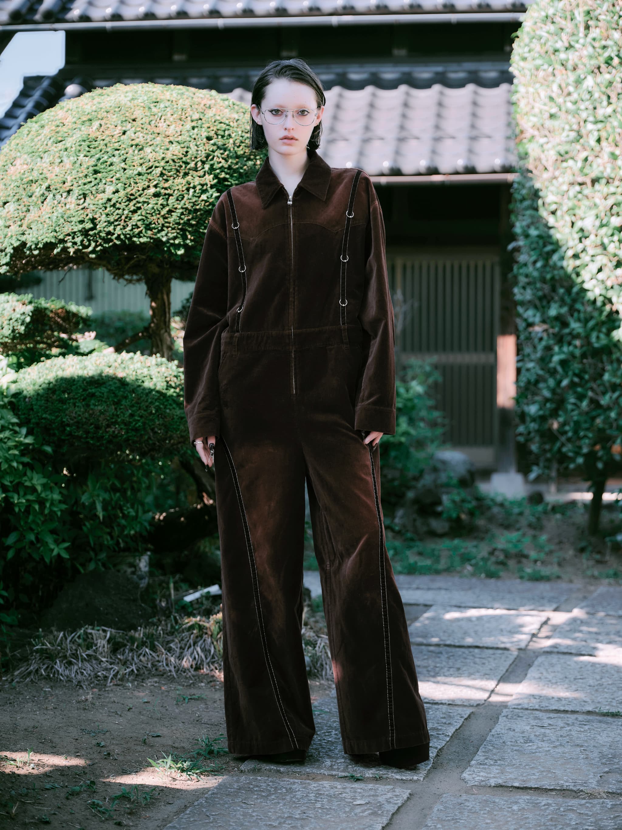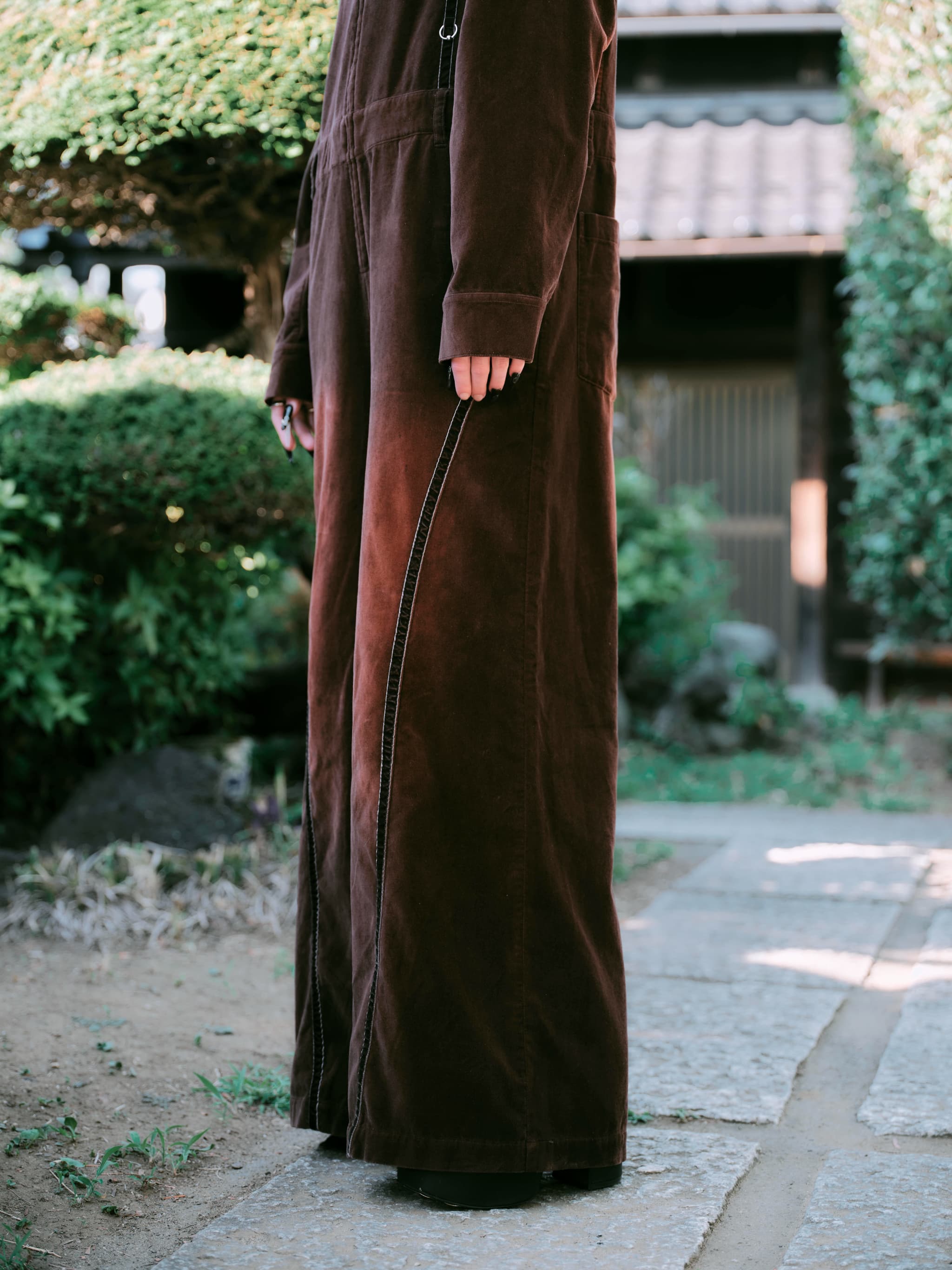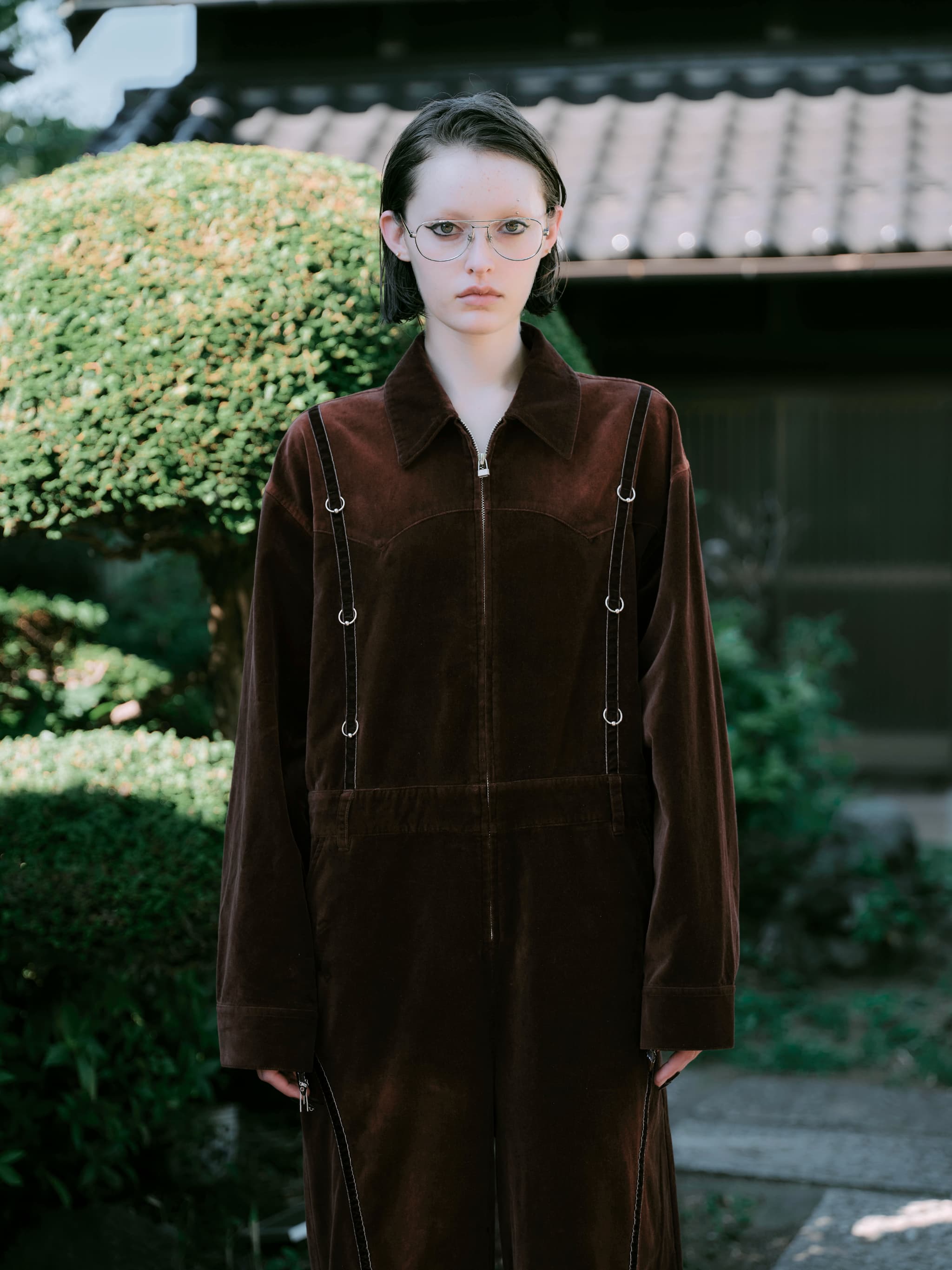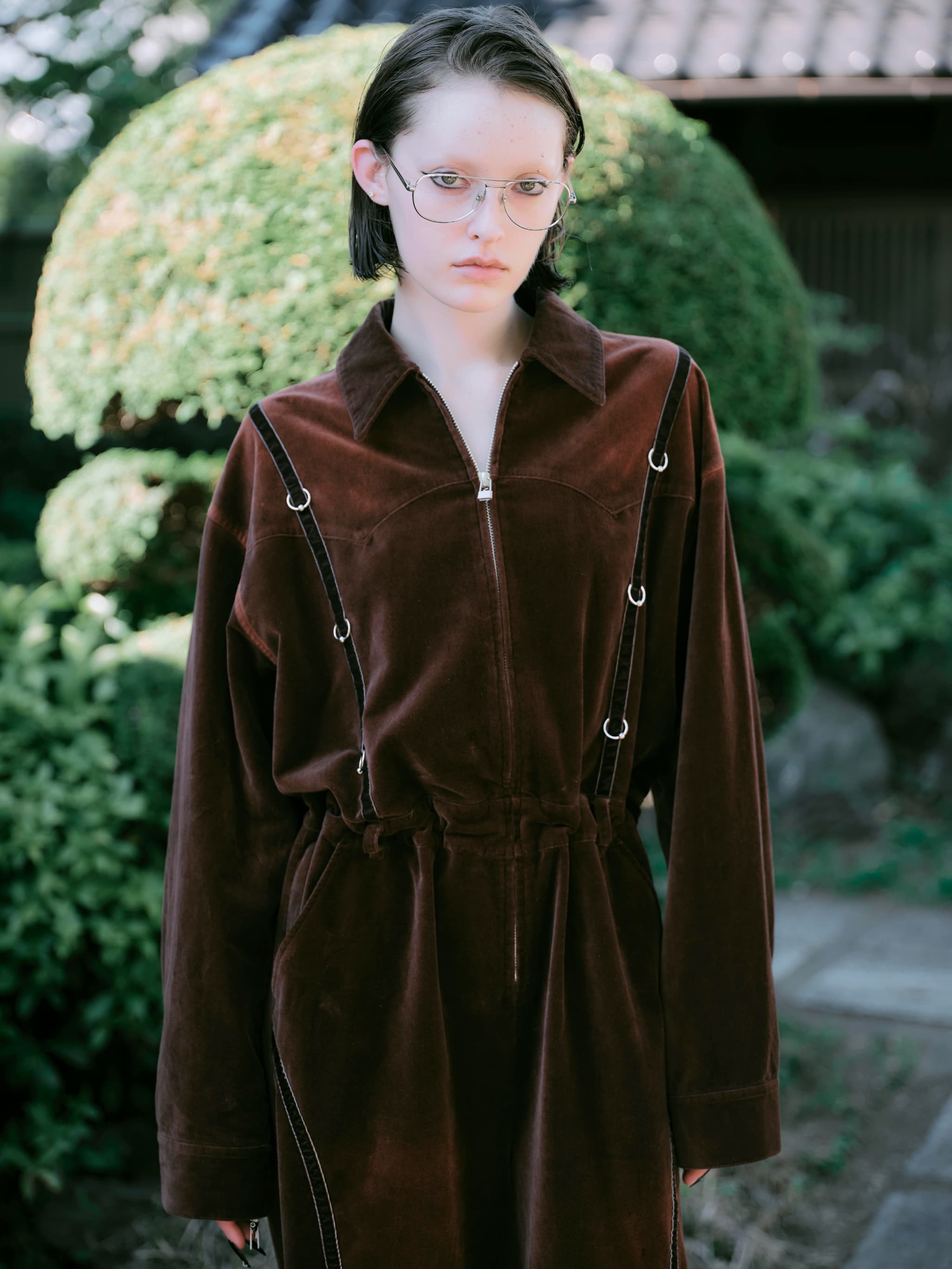 全身を包み込むような存在感を放つ、ベルベット素材のジャンプスーツ。