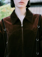 ゆったりとしたワイドシルエットとストレートなラインが、身体の動きを美しく引き立てます。 フロントのジップとピアスディティールがアクセントとなり、シンプルでありながらエッジィな印象を演出。