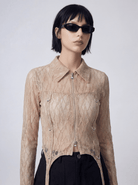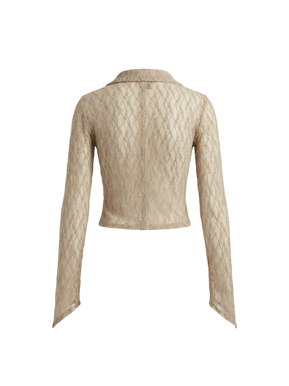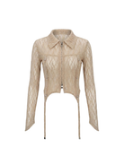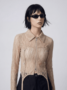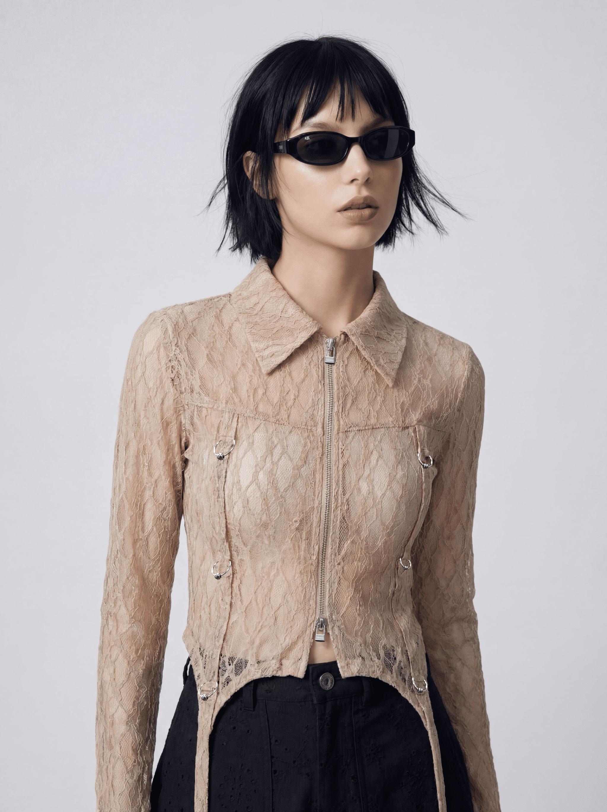 軽やかなレイヤードスタイルを楽しめる、シアーレース素材のジップアップトップ。