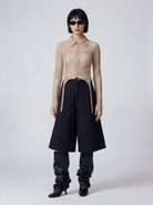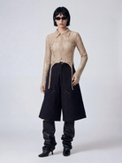 フロントのジップは逆開使用で、表情を変えてお楽しみいただけます。ウエスト部分はカーブを描くカッティングで構築されており、身体のラインをすっきりと美しく見せながら、立体的なバランスを演出します。細く長く伸びる裾のディテールが、動きのある印象的なアクセントに。