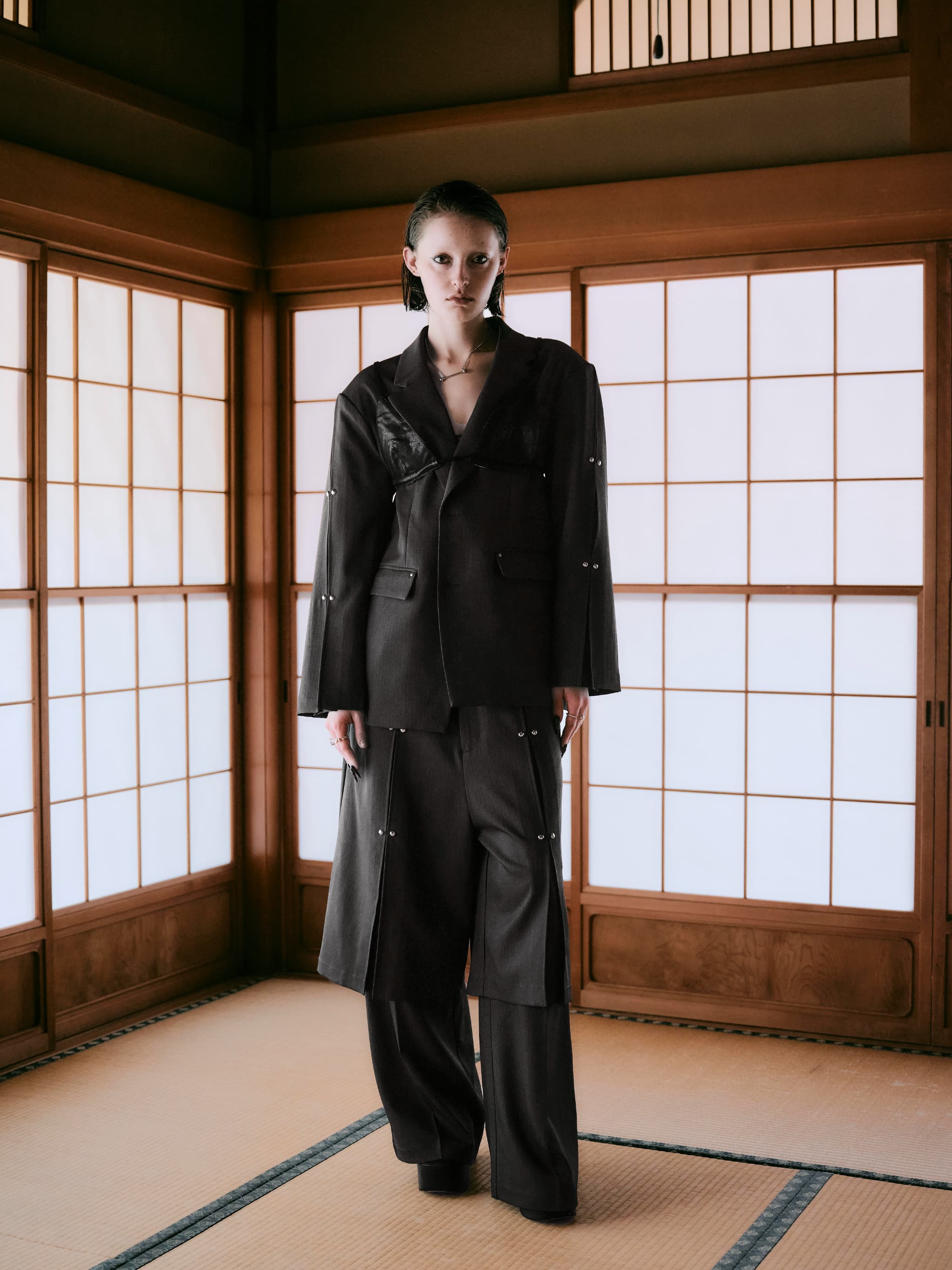 TUCK DESIGN STUDS 2WAY PANTS-CHARCOAL GRAY
