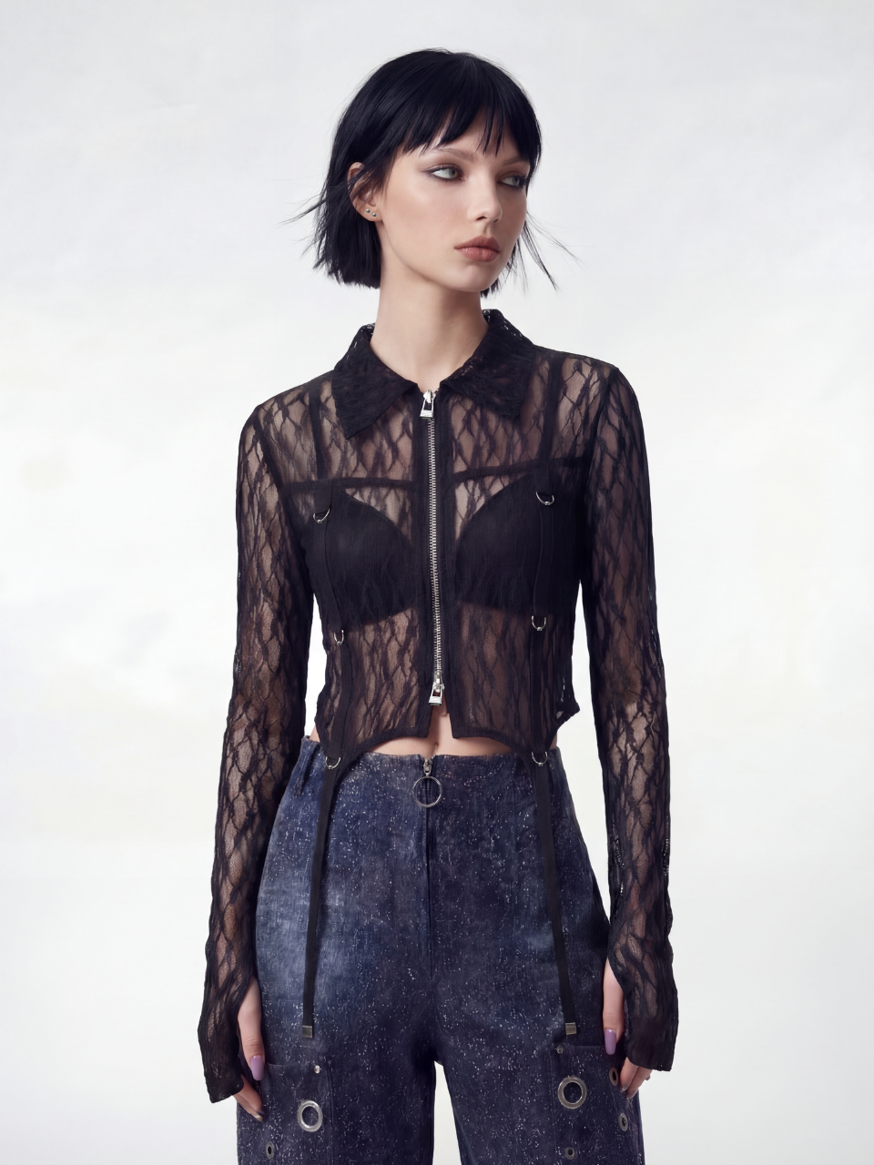 SHEER LACE ZIP-UP TOP-BLACK